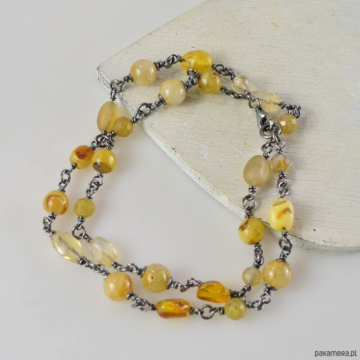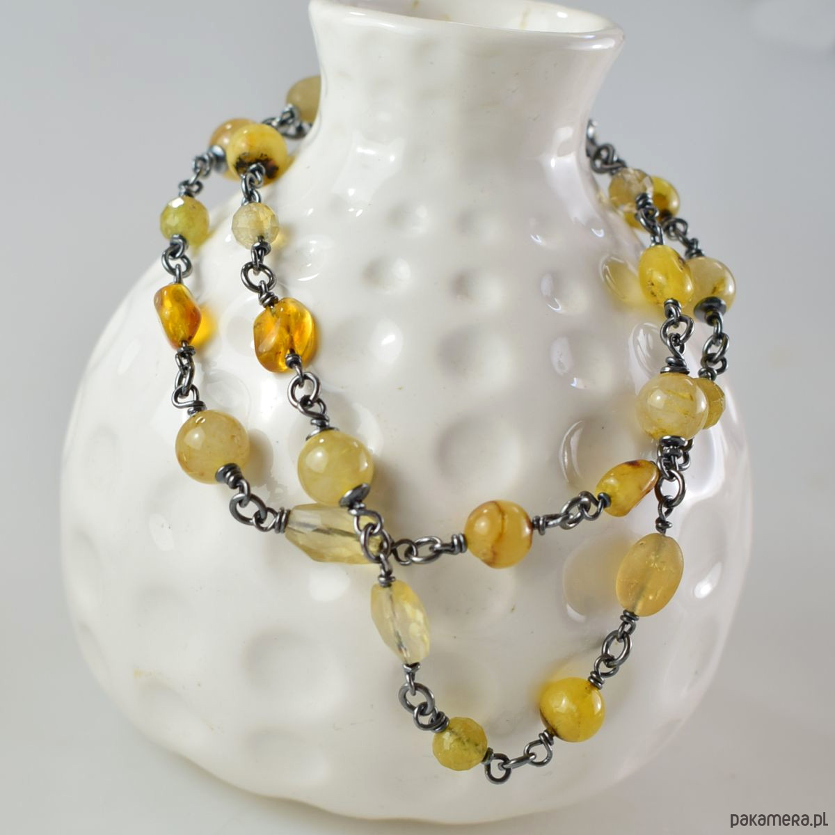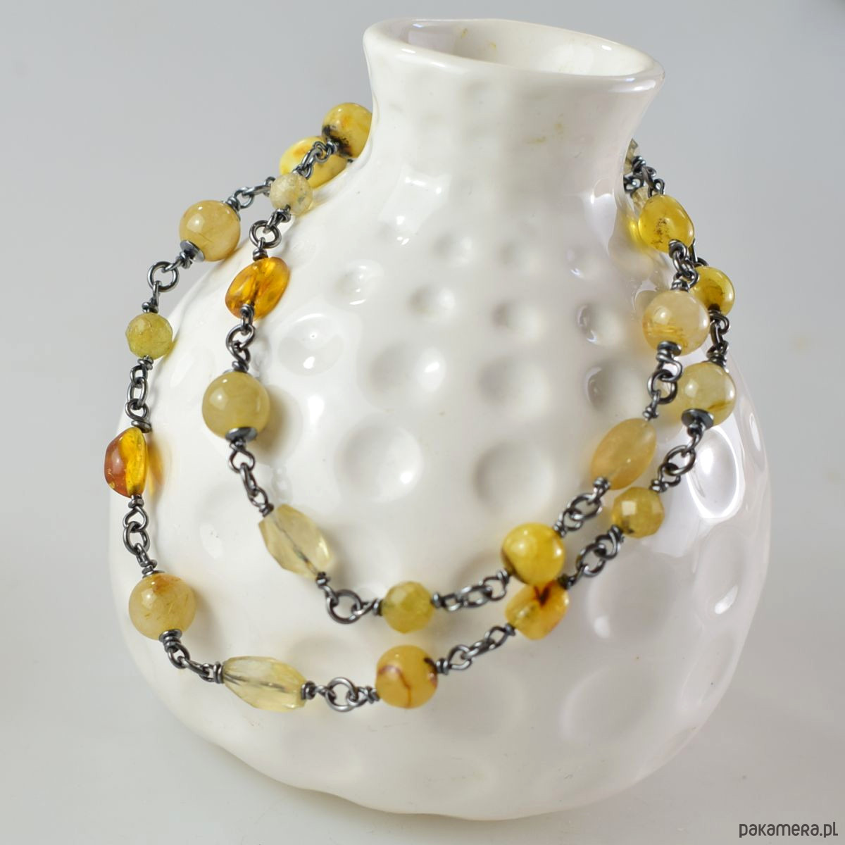 Naszyjnik wykonany w całości ze srebra (próba 925) z takimi kamieniami jak: bursztyn, cytryn, kwarc z rutylem, żółty apatyt. Biżuteria została zoksydowana (przyciemniona) i wypolerowana. Długość całkowita 49 cm. Biżuteria zostanie ozdobnie zapakowana.