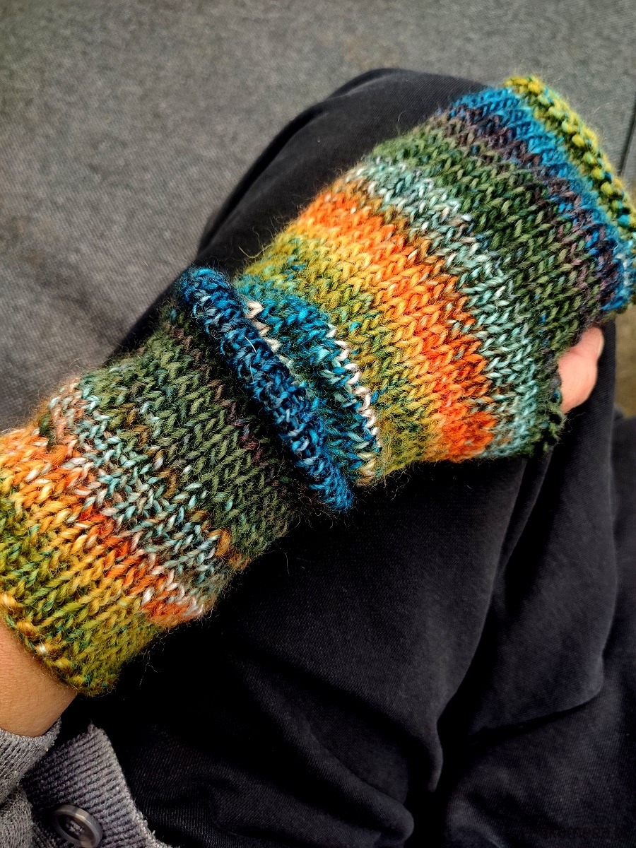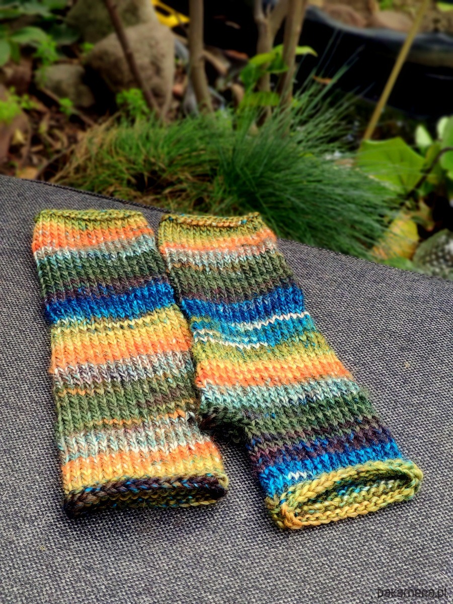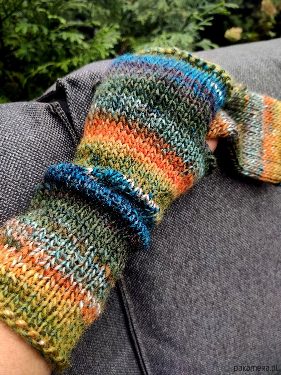 Ciepłe mitenki wykonane na drutach z wysokiej jakości włóczki w optymistycznej kolorystyce. Włóczka- to miękkie i przyjemne dla skóry połączenie wełny oraz akrylu ( 50/ 50%).
