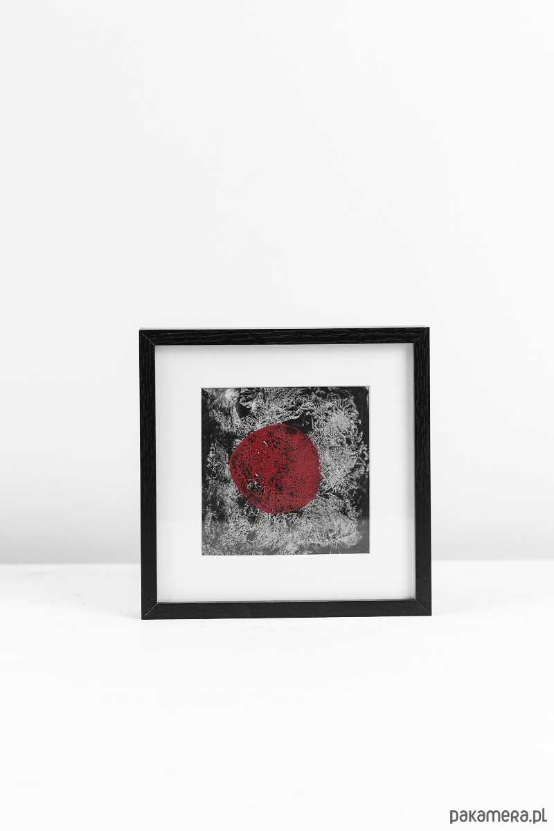 Grafika zatrzymana w czarnej ramce jest jak medytacja nad momentem, gdy płynna materia zastyga w czasie, pozostawiając swój unikalny ślad.