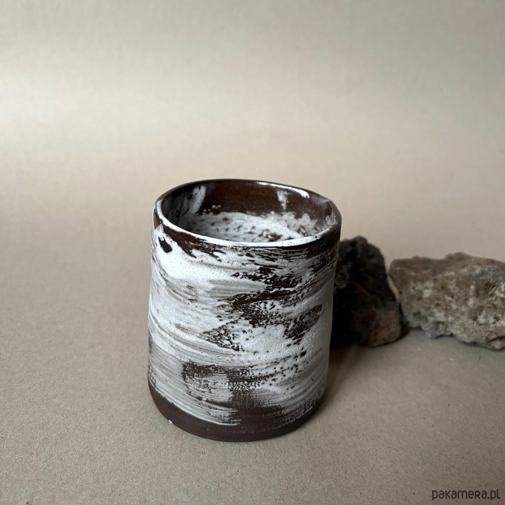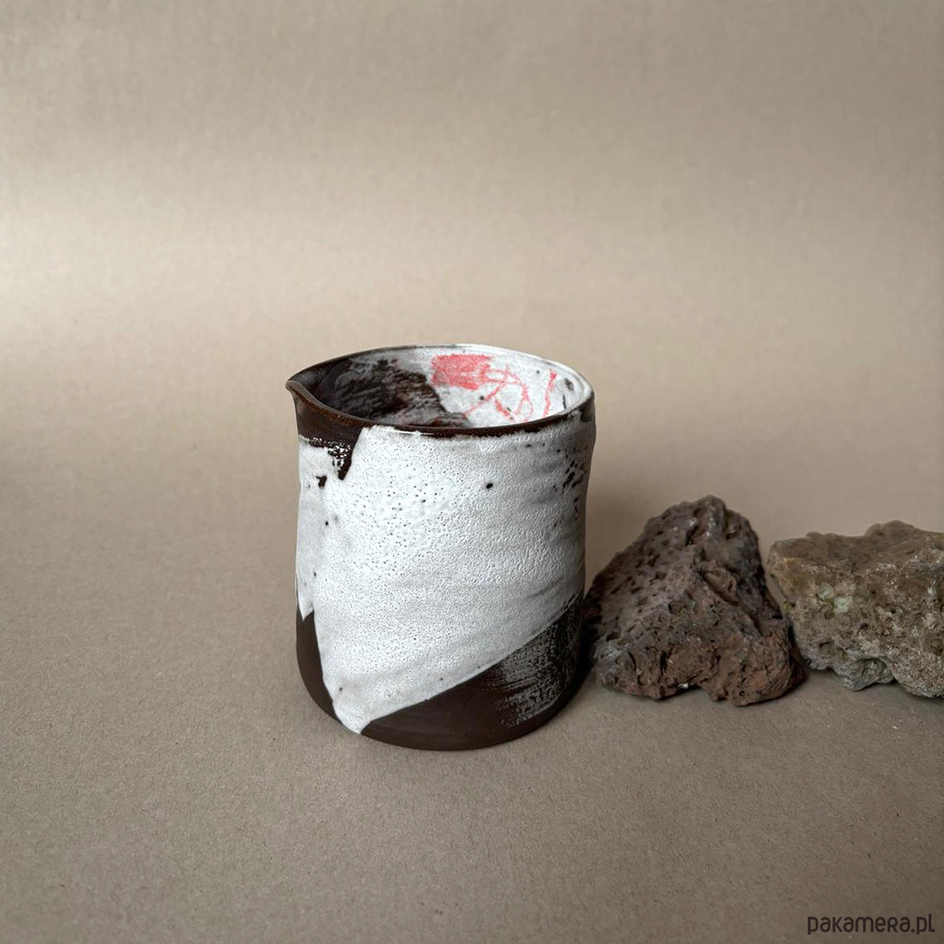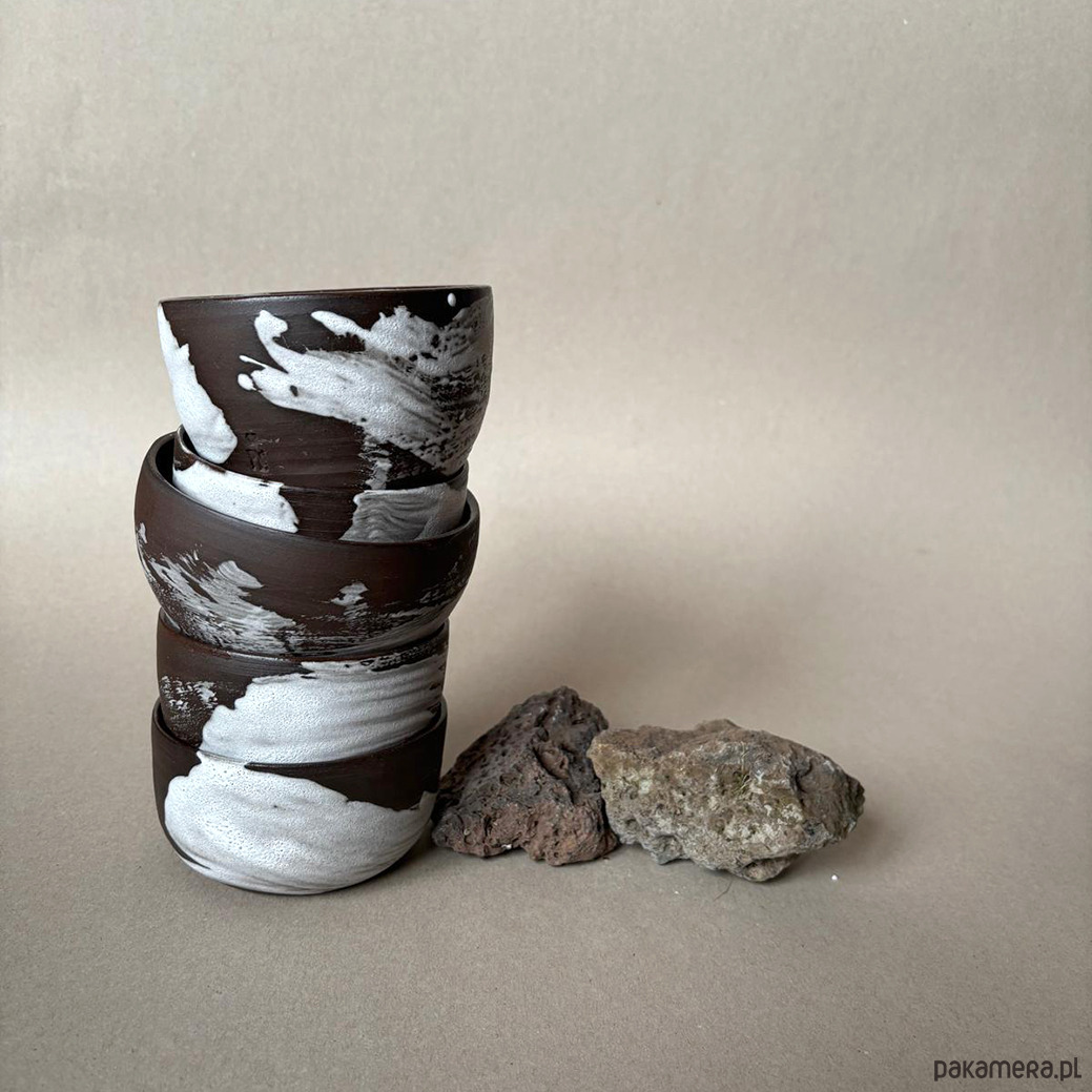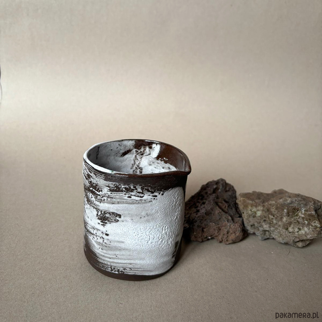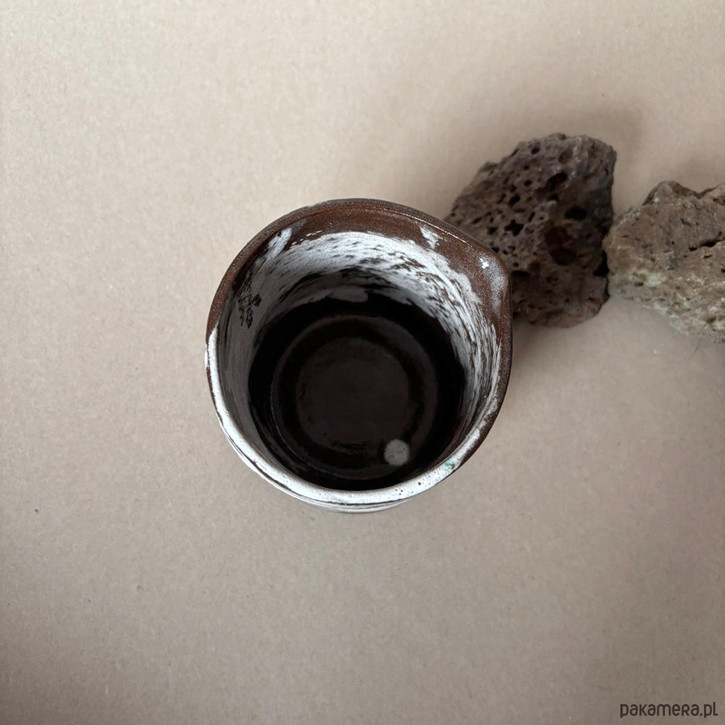 Ciemnobrązowy mlecznik lepiony na kole z brązowej gliny. Malowany pędzlem, surowy w formie i strukturze.