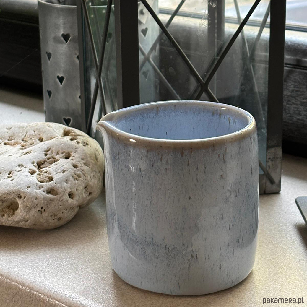 Mlecznik lepiony ręcznie na kole z jasnokremowej gliny. Pokryty błękitnym szkliwem.
