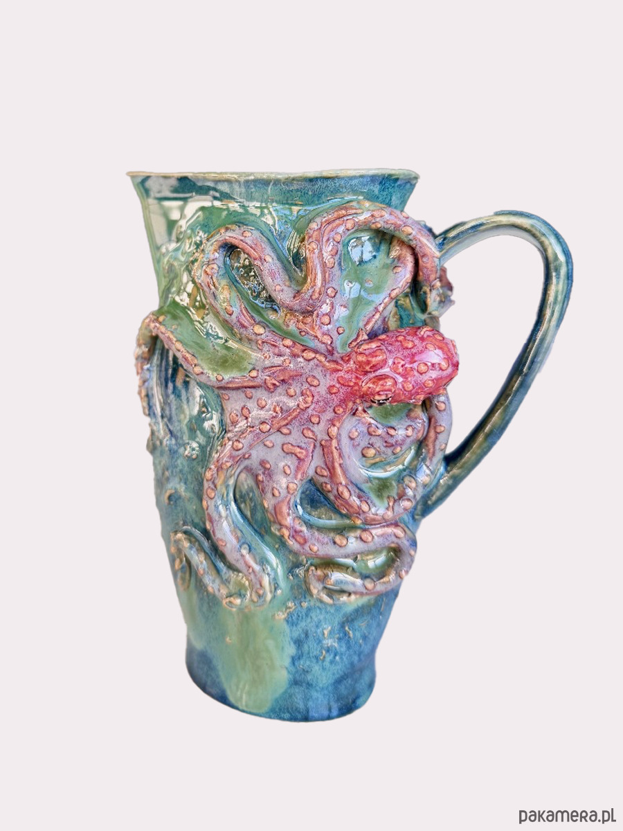 Unikatowy mlecznik/sosjerka ceramiczna z ręcznie uformowaną ośmiornicą o pojemności 200 mililitrów. Mlecznik został pokryty szkliwem odcieniach turkusu inspirowany oceanem i miłością do jego mieszkańców. Prace wykonuje własnoręcznie od początku aż po gotowy produkt. Nie wykonuje prac na masową skalę, a jedynie pojedyncze egzemplarze. Można myć w zmywarce.