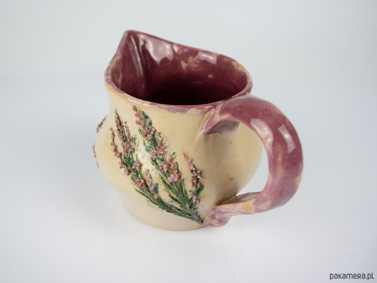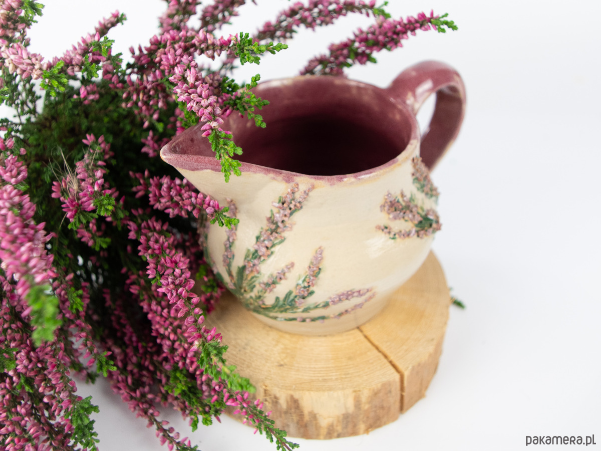 Mlecznik „Wrzos” został wykonany w całości ręcznie – baza naczynia uformowana jest na kole garncarskim, a następnie ozdobiona subtelnym, florystycznym reliefem przedstawiającym gałązki wrzosu. Całość utrzymana jest w naturalnych odcieniach: wnętrze i uchwyt pokryte zostały szkliwem w kolorze śliwkowym/wrzosowym, zewnętrzna powierzchnia zabezpieczona przezroczystym szkliwem, które podkreśla strukturę i ręczną dekorację. Mlecznik jest nie tylko dekoracyjny, ale i w pełni użytkowy – będzie idealnym dodatkiem do każdej zastawy inspirowanej naturą.