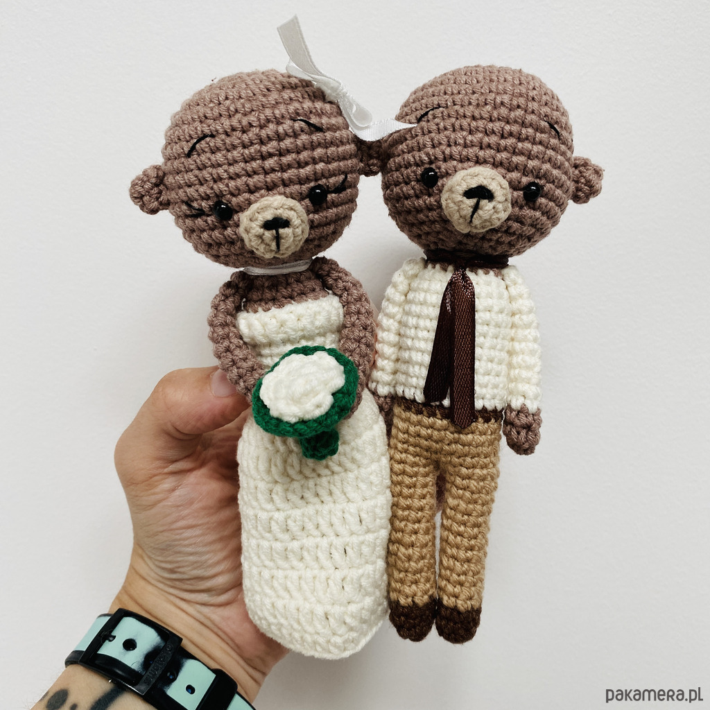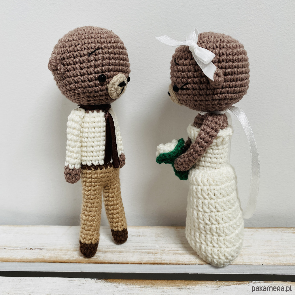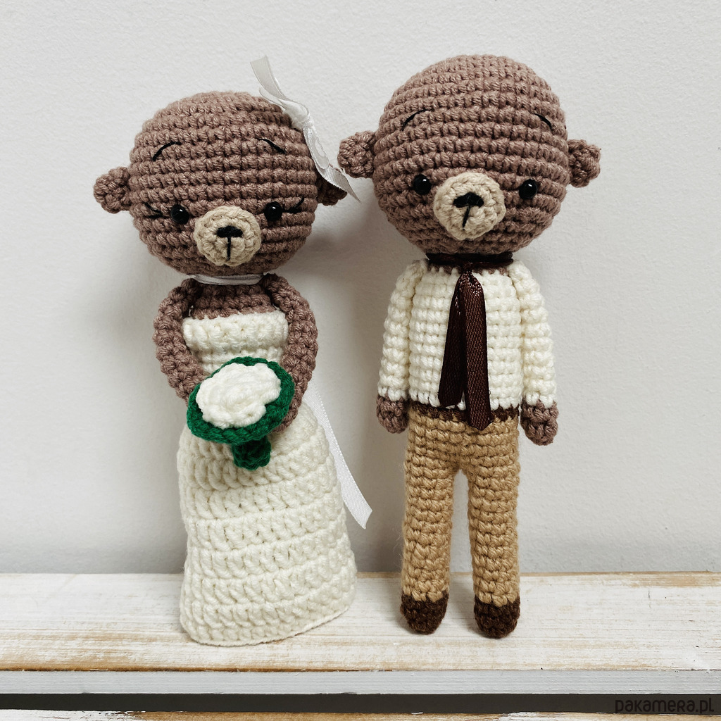 Młoda Para – ślubne misie maskotki, wykonane ręcznie na szydełku z wysokiej jakości bawełny z akrylem, wypełnione antyalergicznym wkładem poduszkowym.