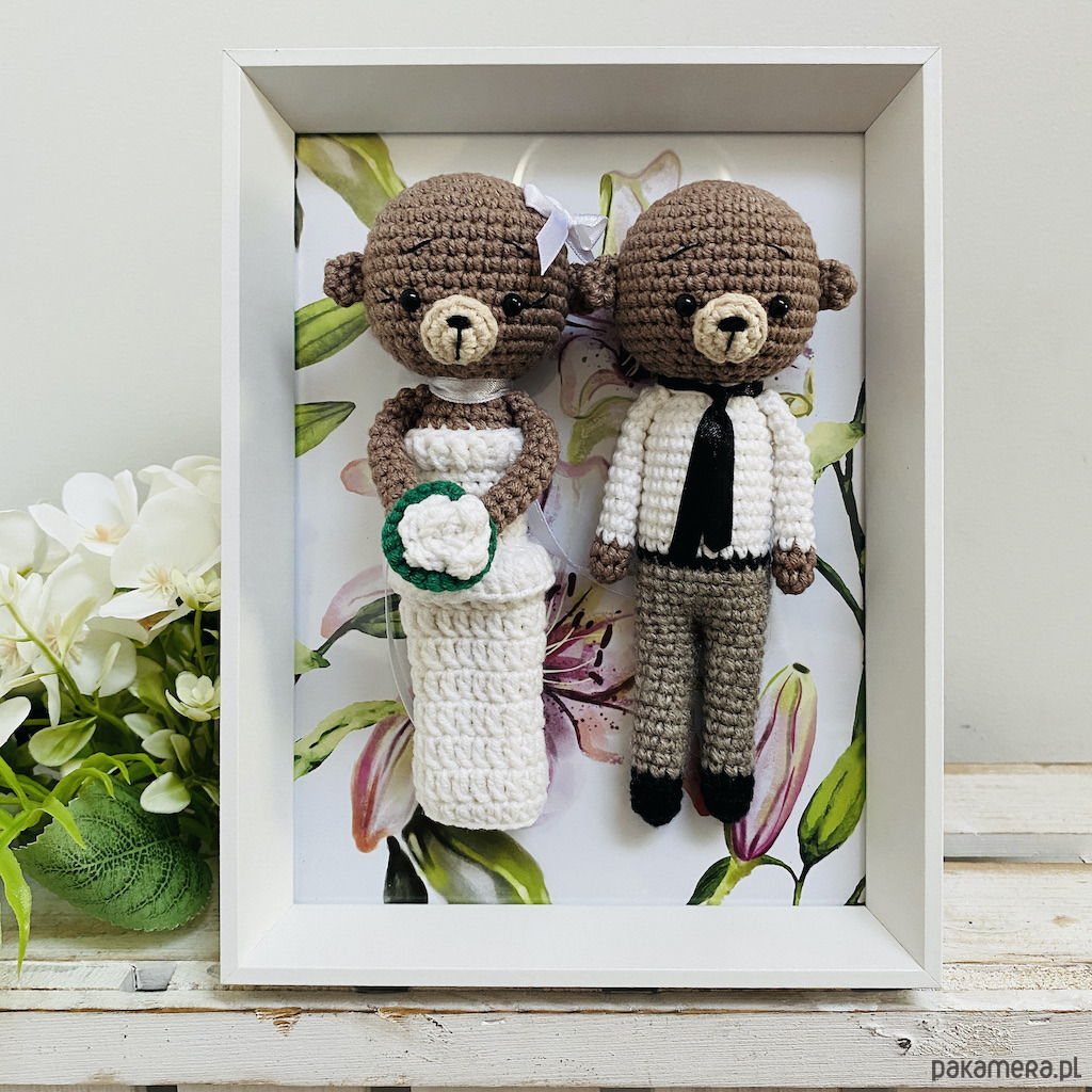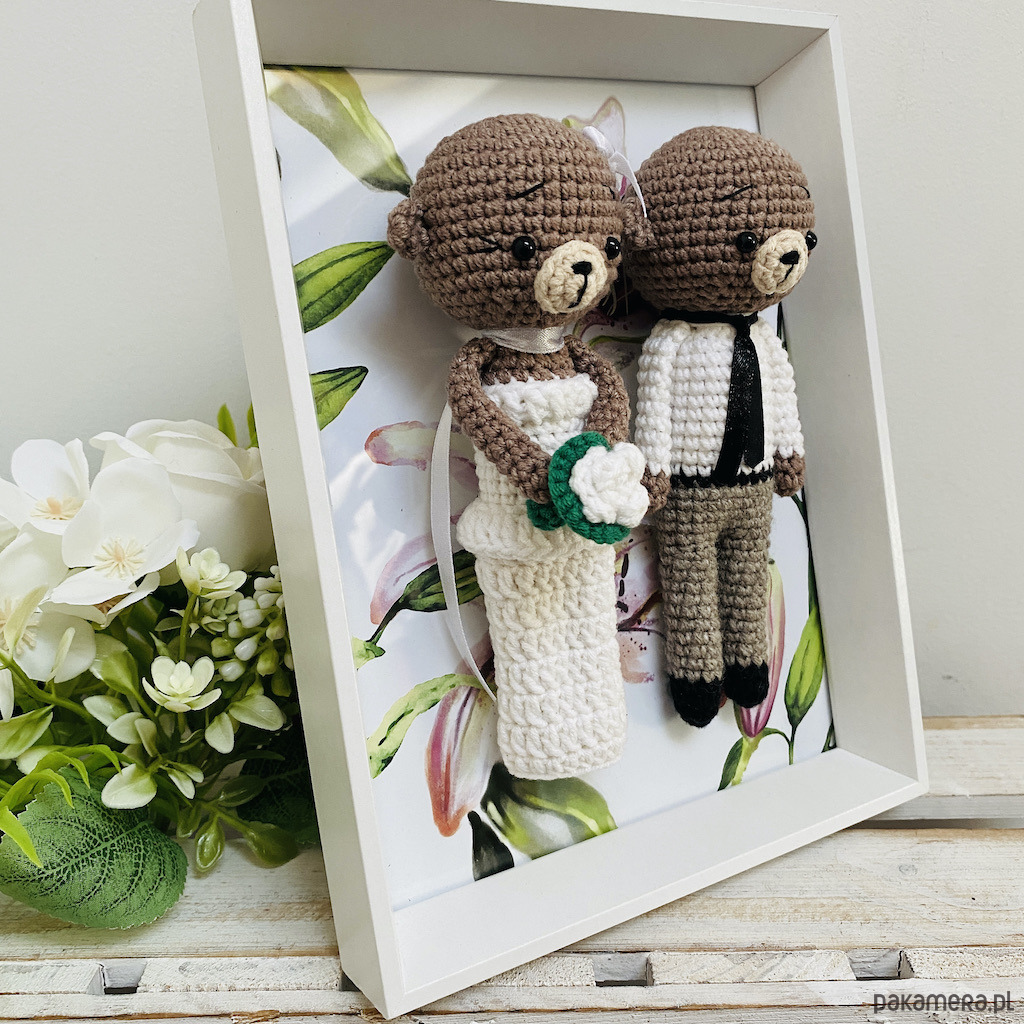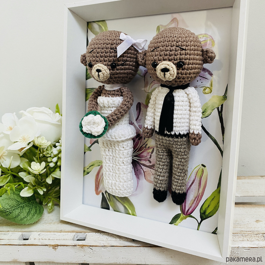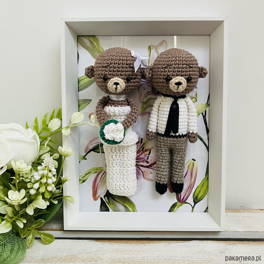 Młoda Para – misie maskotki w białej ramce ręcznie robione na szydełku – idealny prezent ślubny