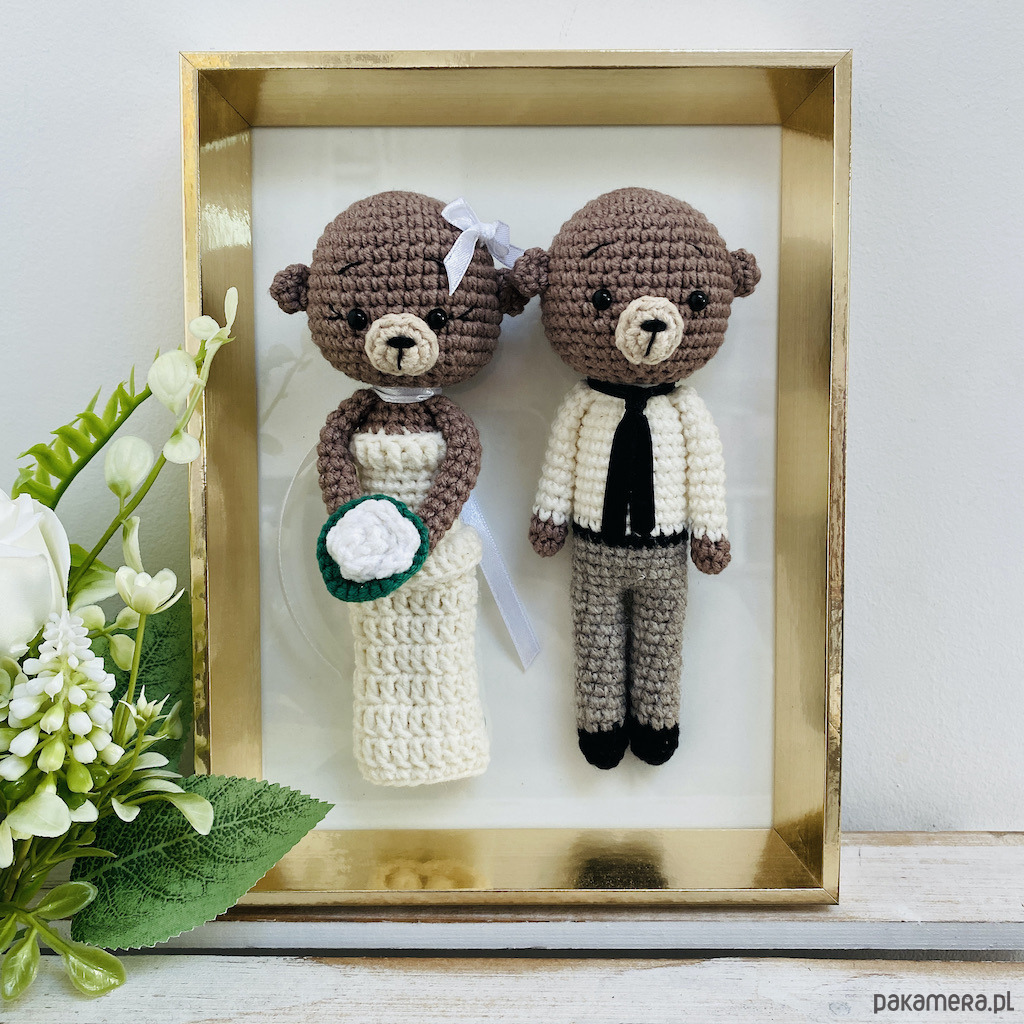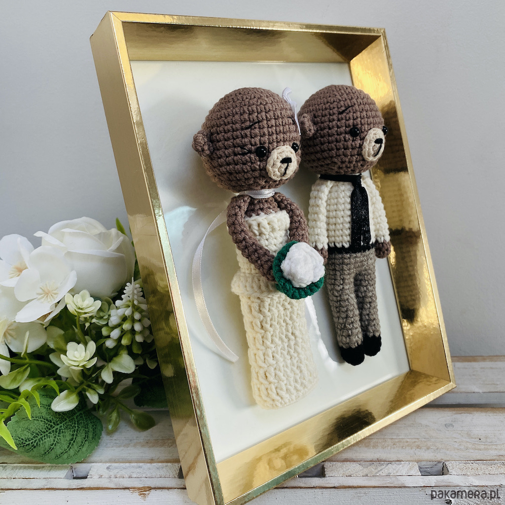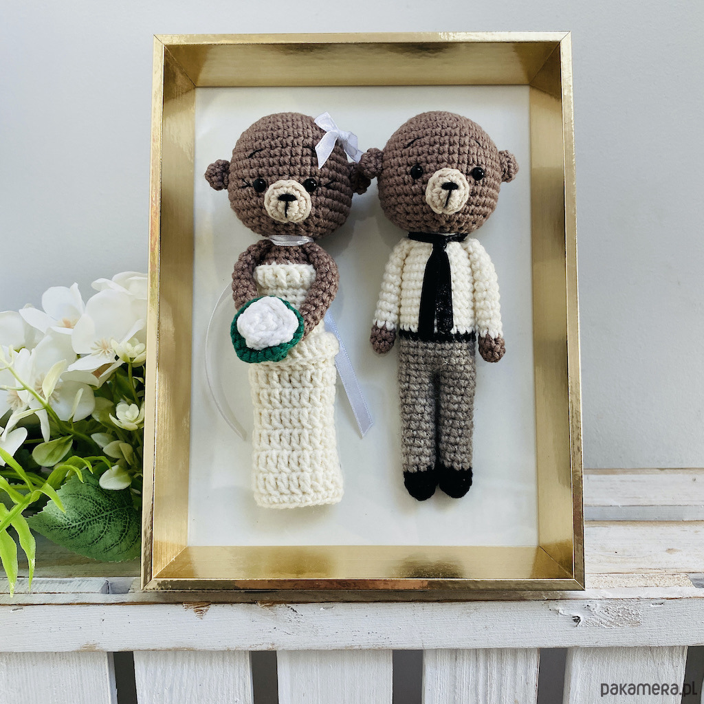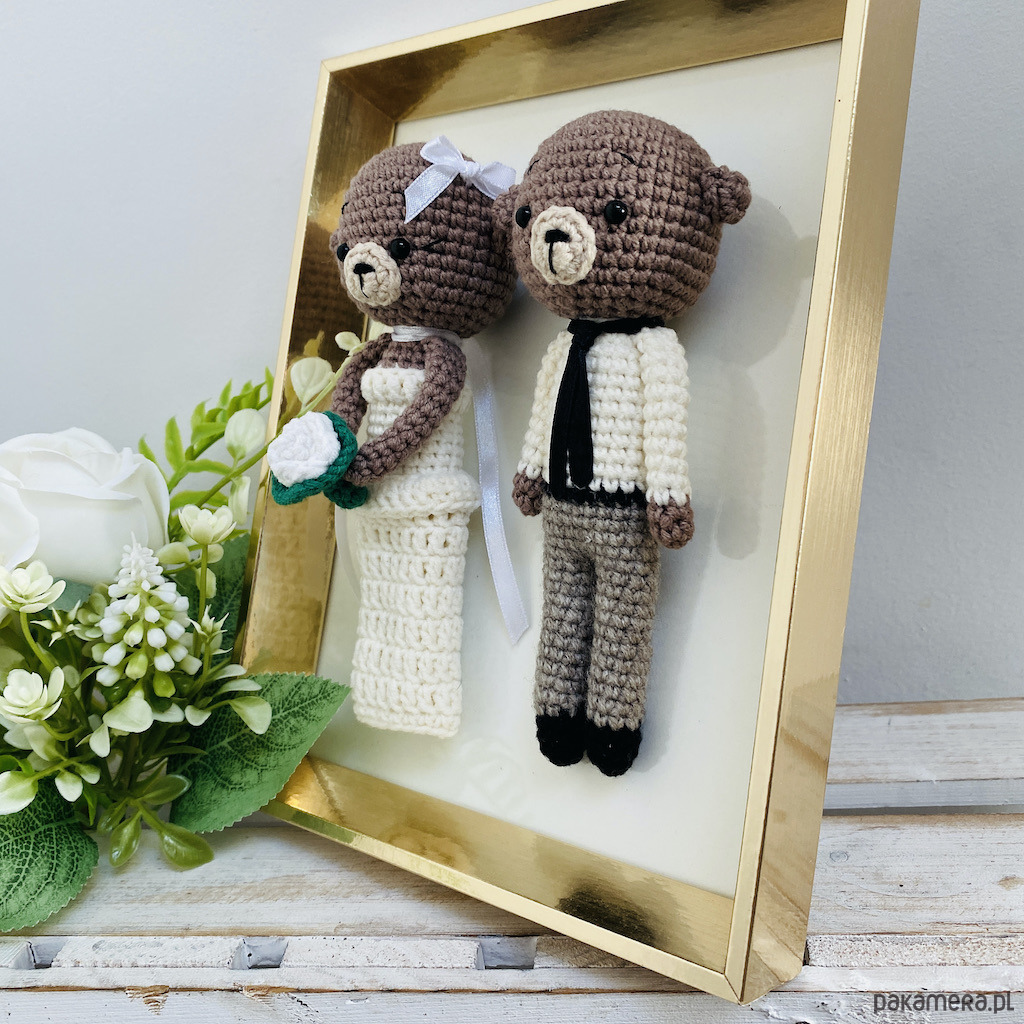 Młoda Para – misie maskotki w złotej ramce ręcznie robione na szydełku – idealny prezent ślubny