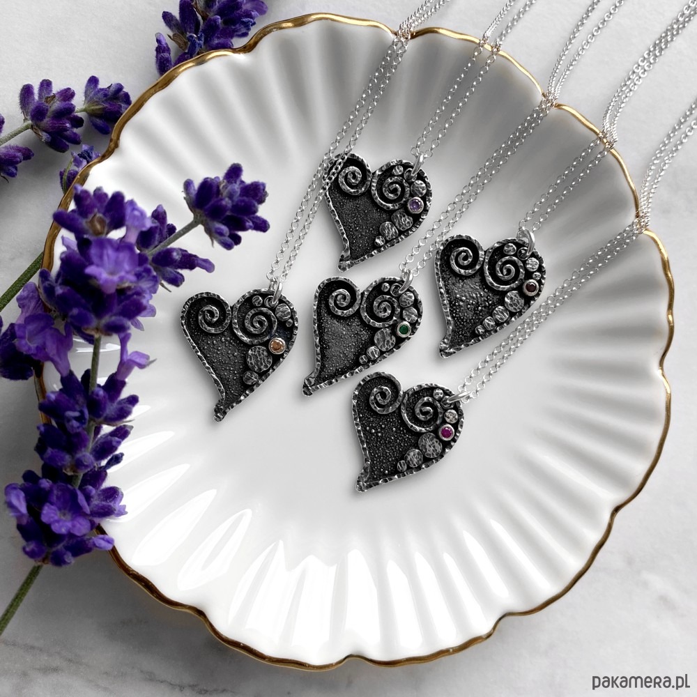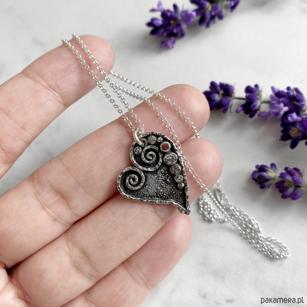 Niezwykle oryginalny naszyjnik w kształcie serca, który został wykonany od podstaw ręcznie ze srebra próby 925, 999 oraz maleńkiej cyrkonii.