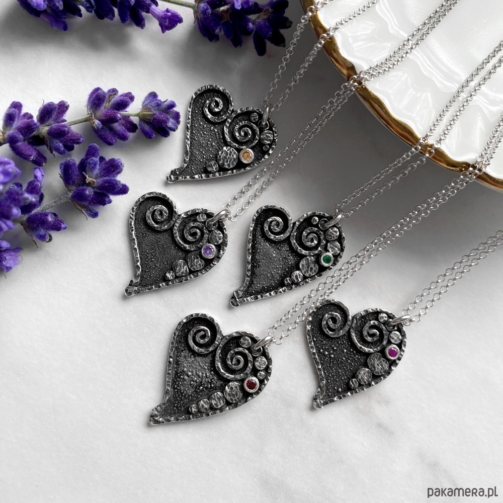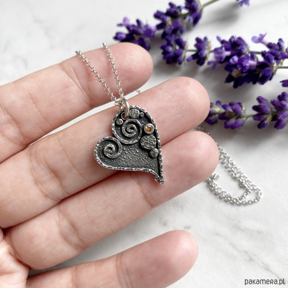Niezwykle oryginalny naszyjnik w kształcie serca, który został wykonany od podstaw ręcznie ze srebra próby 925, 999 oraz maleńkiej cyrkonii.