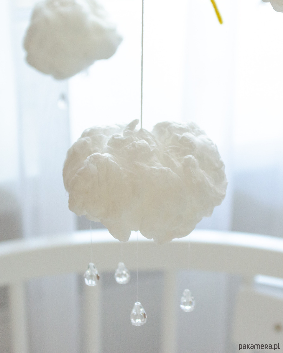 Ten mobil łączy miękkie bawełniane chmurki, filcowe słoneczko i szklane krople deszczu, tworząc wyjątkową dekorację o spokojnym, eleganckim charakterze. Proste kształty i kontrasty przyciągają uwagę niemowlęcia, wspierając rozwój wzroku i wyobraźni.