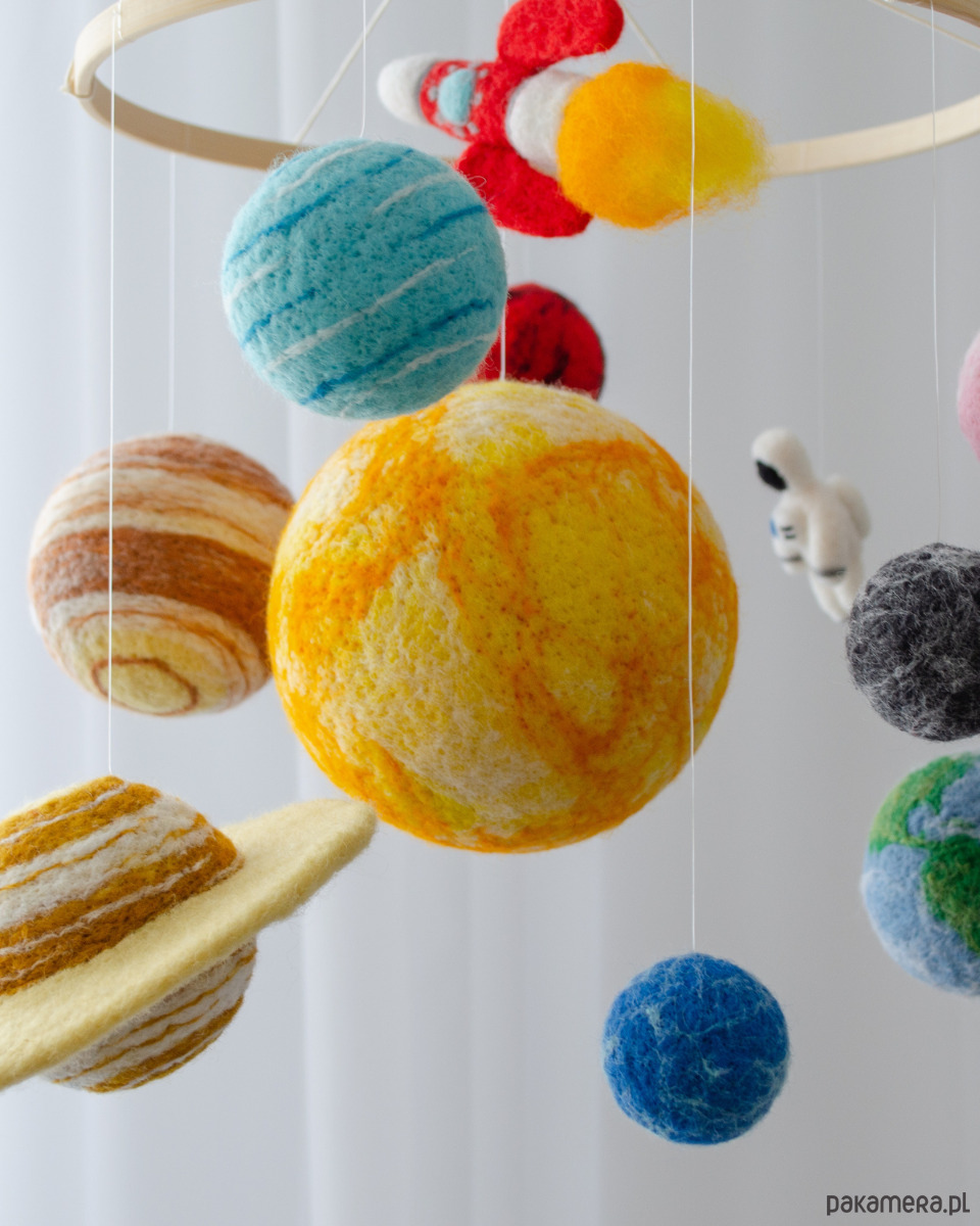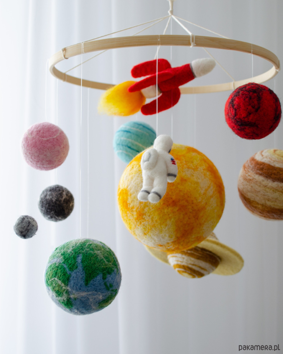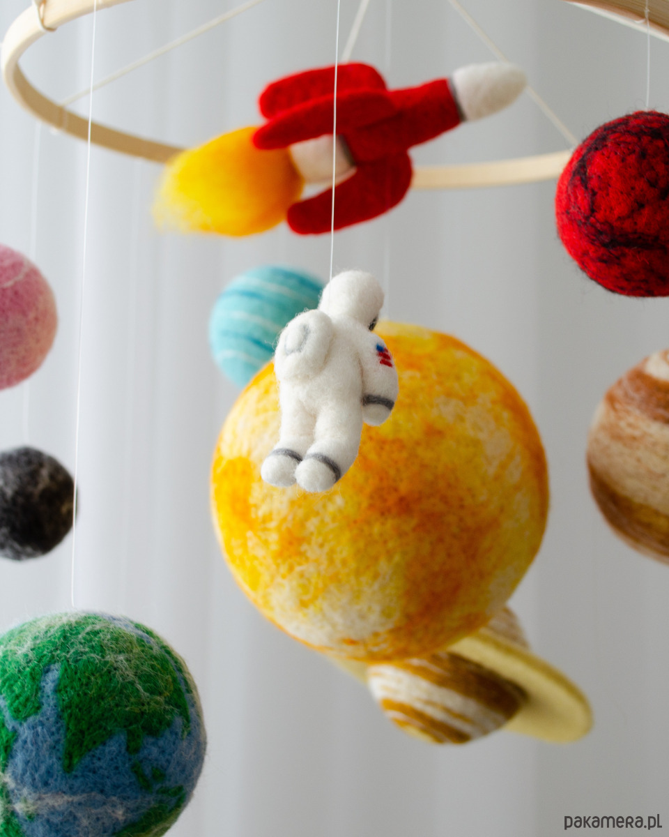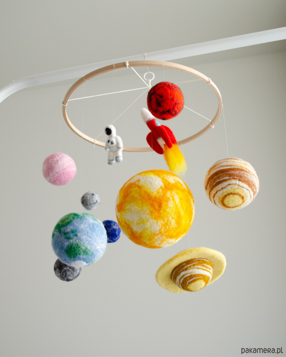 Wyjątkowa karuzela nad łóżeczko inspirowana układem słonecznym. Filcowe planety, słońce, rakieta i mały astronauta unoszą się lekko nad łóżeczkiem, tworząc magiczną atmosferę kosmosu. To dekoracja, która pobudza wyobraźnię i wspiera rozwój zmysłów niemowlęcia.