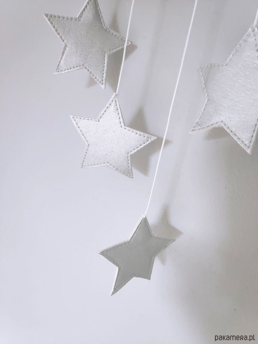 Mobil uszyty jest ze zmiękczanego lnu, jest to naturalna ekologiczna tkanina. Pięknie wykończony, a całości uroku dodają 4 srebrne metaliczne gwiazdki. Mobil wisi na białym cienkim, ale trwałym sznureczku, dzięki czemu łatwo zawiesisz go w wybranym miejscu, jednocześnie nie będzie się rzucał w oczy.