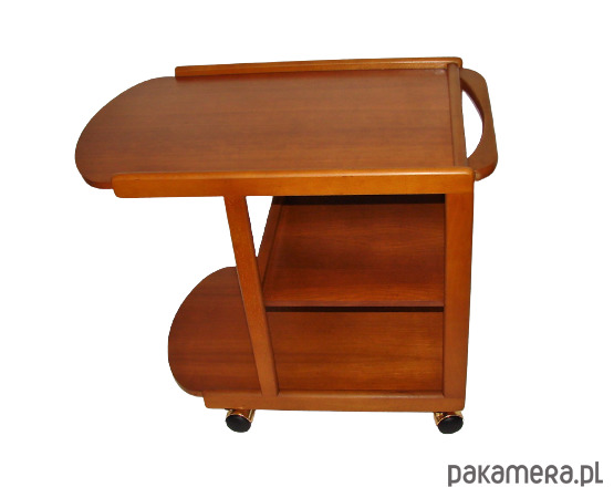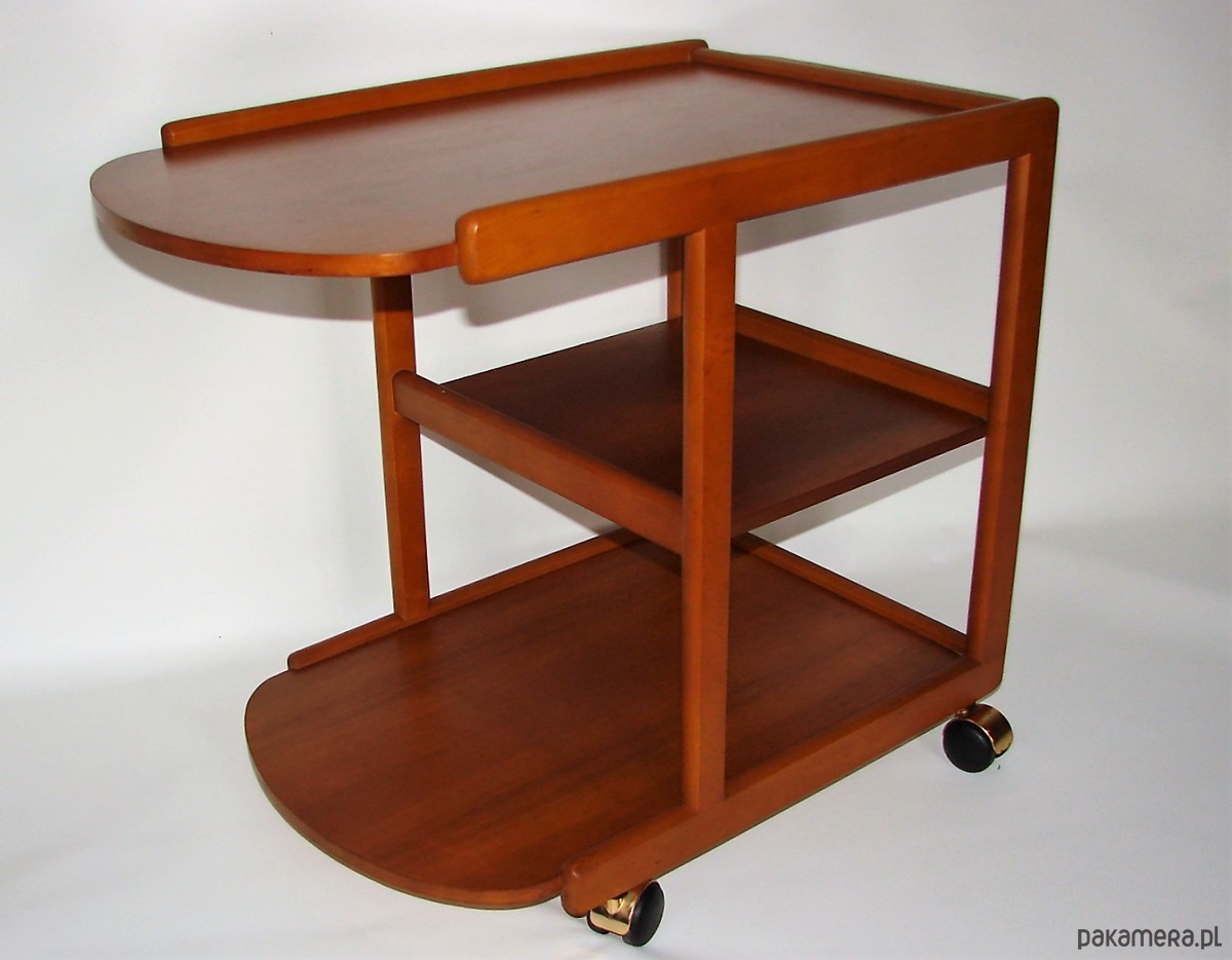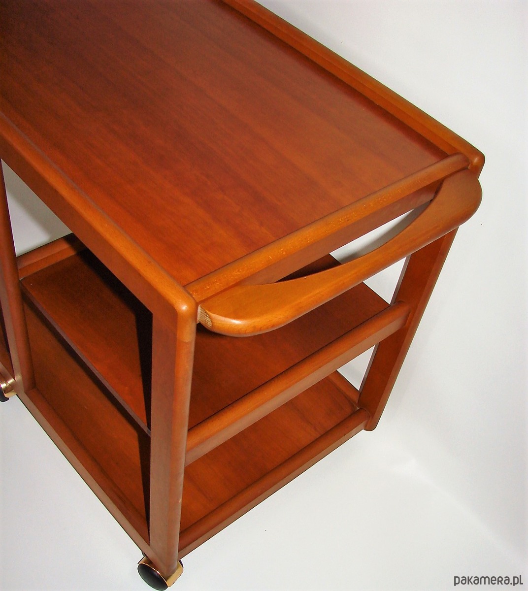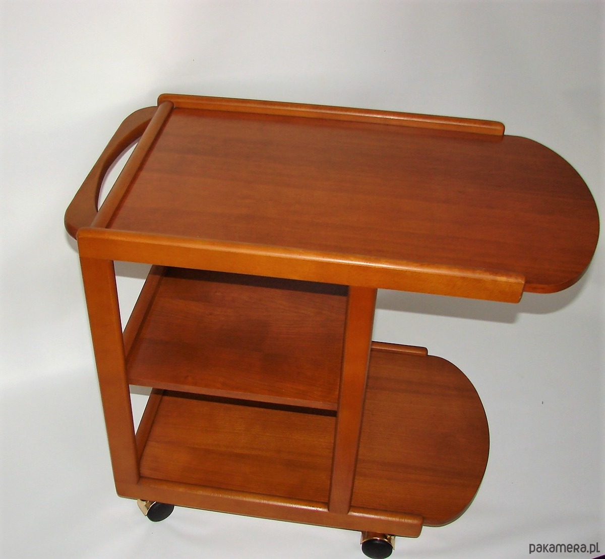 Mobilny barek, lata 70. Został wykonany z drewna bukowego i tekowego.