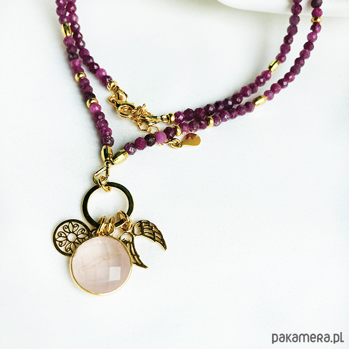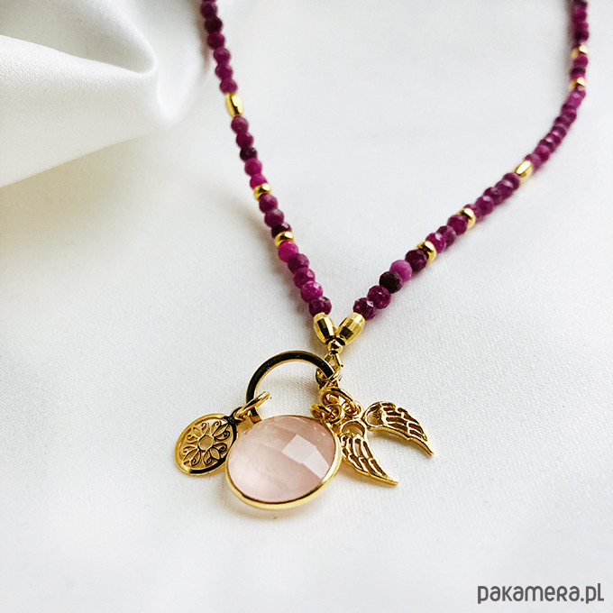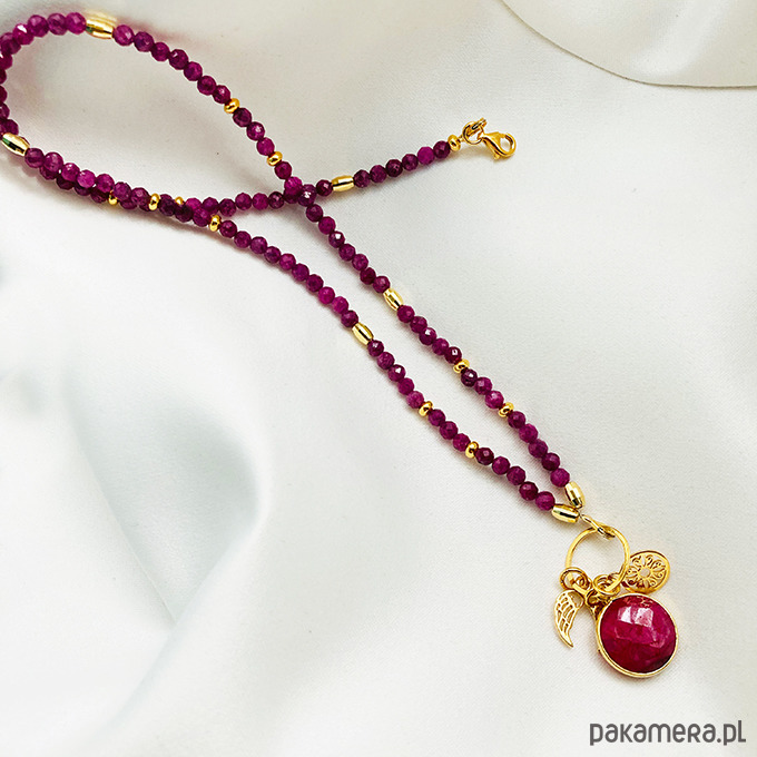 Ten naszyjnik, wykonany z fasetowanych korali rubinowych i elementów pozłacanych 24-karatowym złotem, jest naprawdę wyjątkowy.Zestawienie z geometryczną delikatną rozetką oraz skrzydełkami i naturalnym rubinem w okuciu , nadaje temu naszyjnikowi wyjątkową symbolikę. Skrzydła są symbolem niczym nieograniczonej wolności i swobody, wyobraźni i realizacji marzeń. Rozetka symbolizuje słońce, przynosząc szczęście, a rubin jest kamieniem obfitości i dynamizmu, namiętności i miłości, inspiruje także do poszukiwania szczęścia, do zmiany na lepsze. Od starożytności jest uznawany za symbol bogactwa i dobrobytu.