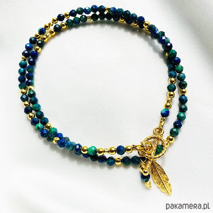 Efektowny naszyjnik typu choker, skomponowany z naturalnych, ręcznie dobranych kamieni azurytu w hipnotyzujących odcieniach morskiej zieleni i głębokiego granatu. Każdy kamień jest unikatowy, tworząc biżuterię o silnym, wyrazistym charakterze.