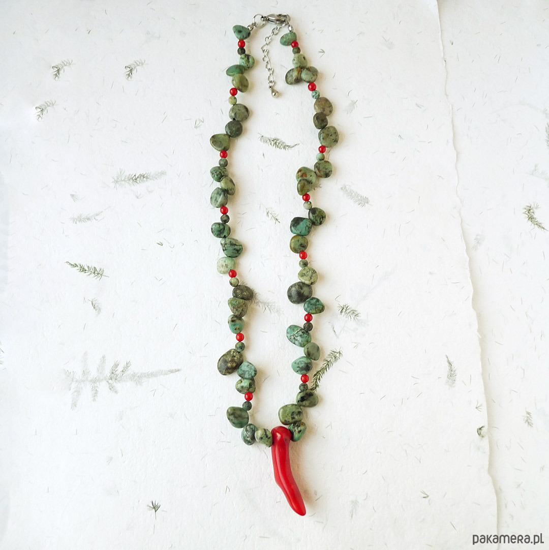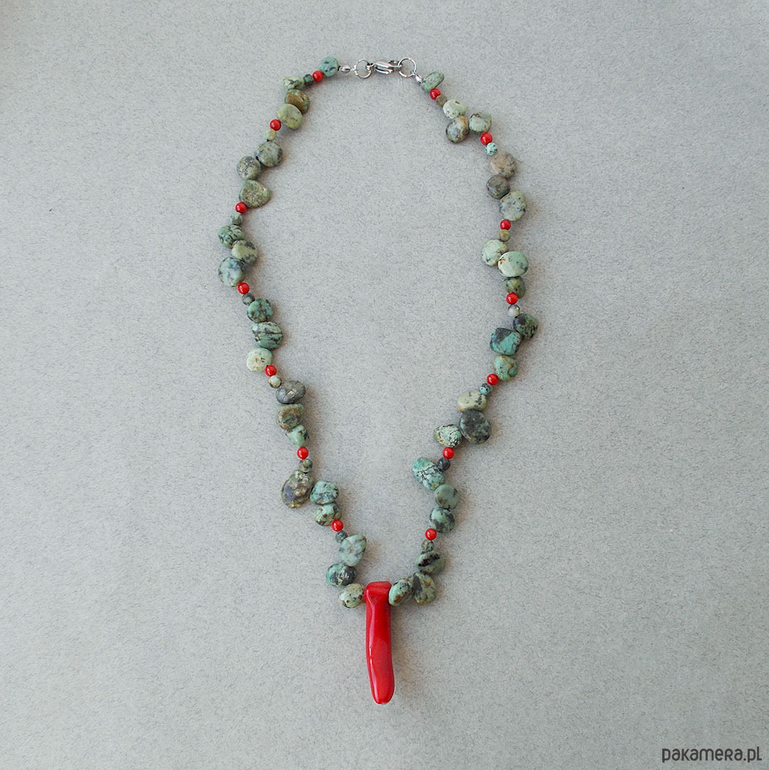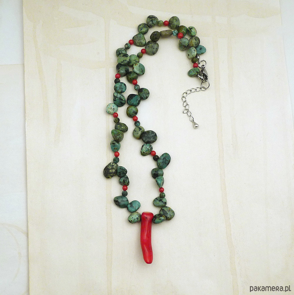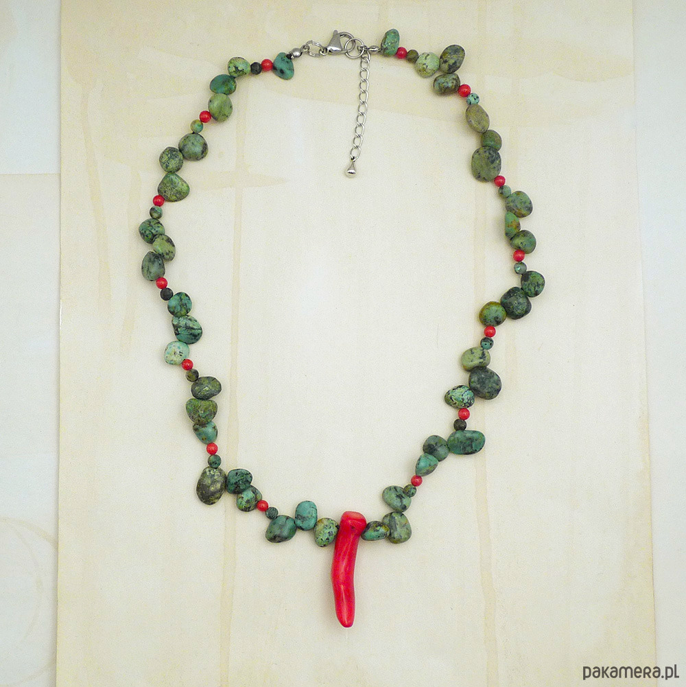 turkus afrykański nieregularne pastylki 6-14 mm odcień zielony, koral czerwony papryczka 40 mm, koral kulki 4 mm, stal szlachetna (zapięcie, łańcuszek)