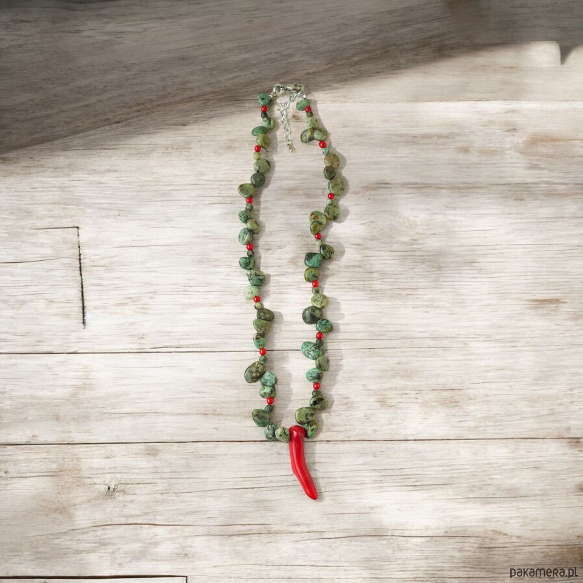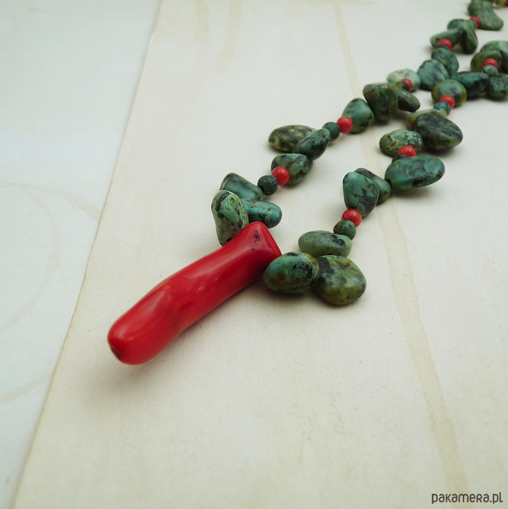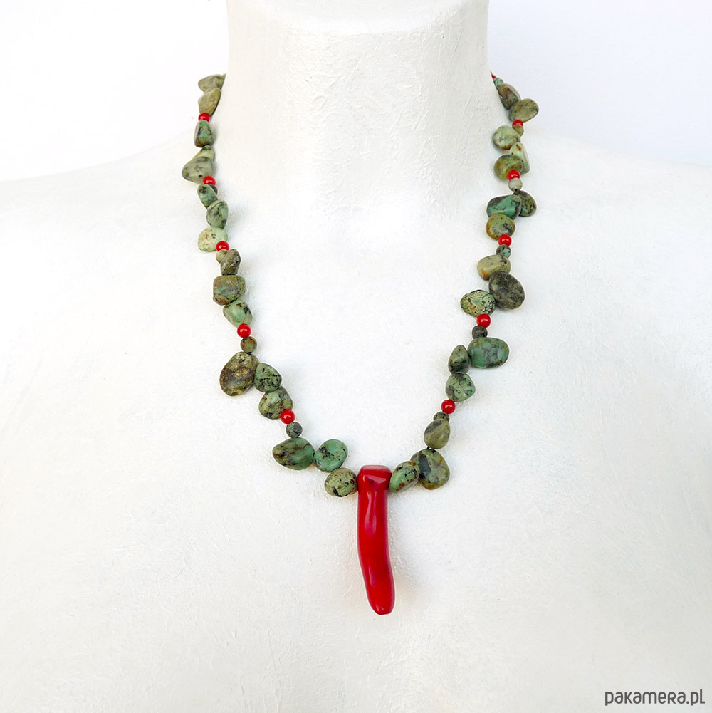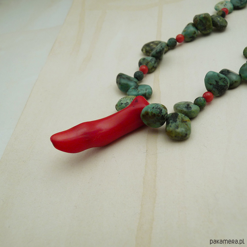 turkus afrykański nieregularne pastylki 6-14 mm odcień zielony, koral czerwony papryczka 40 mm, koral kulki 4 mm, stal szlachetna (zapięcie, łańcuszek)