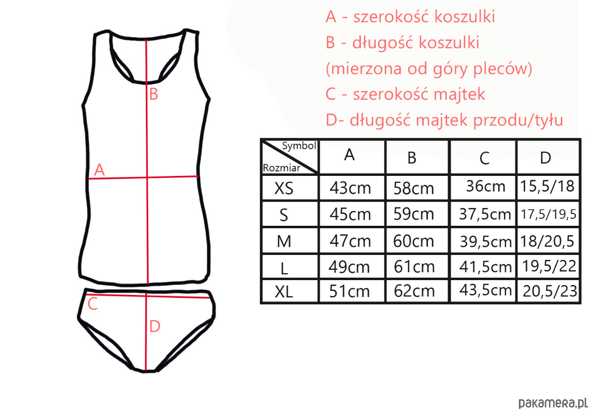 Majtki są dopasowane, natomiast koszulka jest luźna, tak by nie krępować Twoich ruchów. Modelka ma 170cm wzrostu i ma na sobie rozmiar S. Rozmiar dobieraj zawsze do majtek. Koszulka jest dużo luźniejsza i nie zaszkodzi jeśli będzie oversize-m. Jeśli wahasz się między dwoma rozmiarami, weź większy.