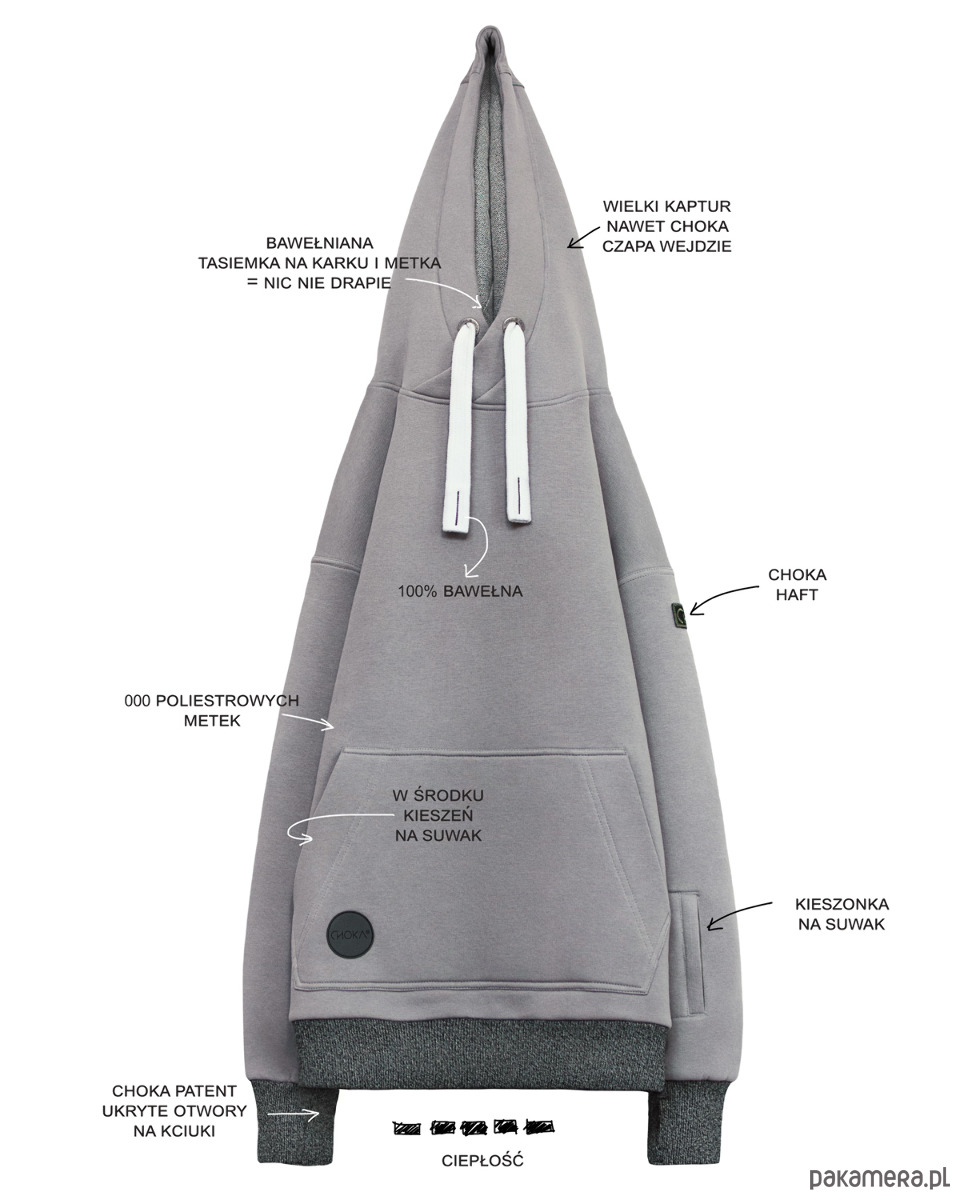 Bluza CHOKA LAZY KANGAROO GREY wykonana jest z bardzo ciepłej, miękkiej, a jednocześnie trwałej, najwyższej jakości dzianiny. Świetnie chroni przed wiatrem: wyposażona jest w wielki kaptur, pod który wejdzie czapka i otwory na kciuki. LAZY KANGAROO ma aż 3 kieszenie, w tym 2 zapinane na suwak - jedną na przedramieniu i jedną ukrytą w kangurce. Na ramieniu haft CHOKA.