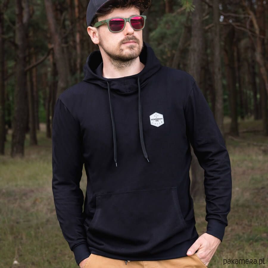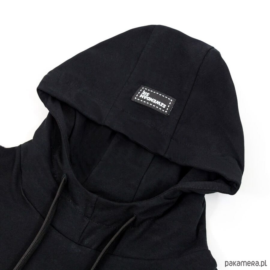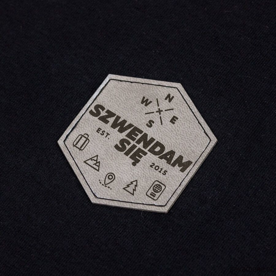 Nierozpinana bluza unisex posiada trzypanelowy kaptur regulowany za pomocą sznurków, wysoką stójkę oraz sporych rozmiarów kieszeń kangurkę, do której włożysz telefon, czy portfel. Wygodny krój nie krępuje ruchów i sprawia, że poczujesz się w niej niezwykle komfortowo. Bluza kangurka w czarnym kolorze z minimalistyczną naszywką na lewej piersi.. Naszywka z napisem Szwendam się została zrobiona z ekoskóry i ma kształt heksagonu.
