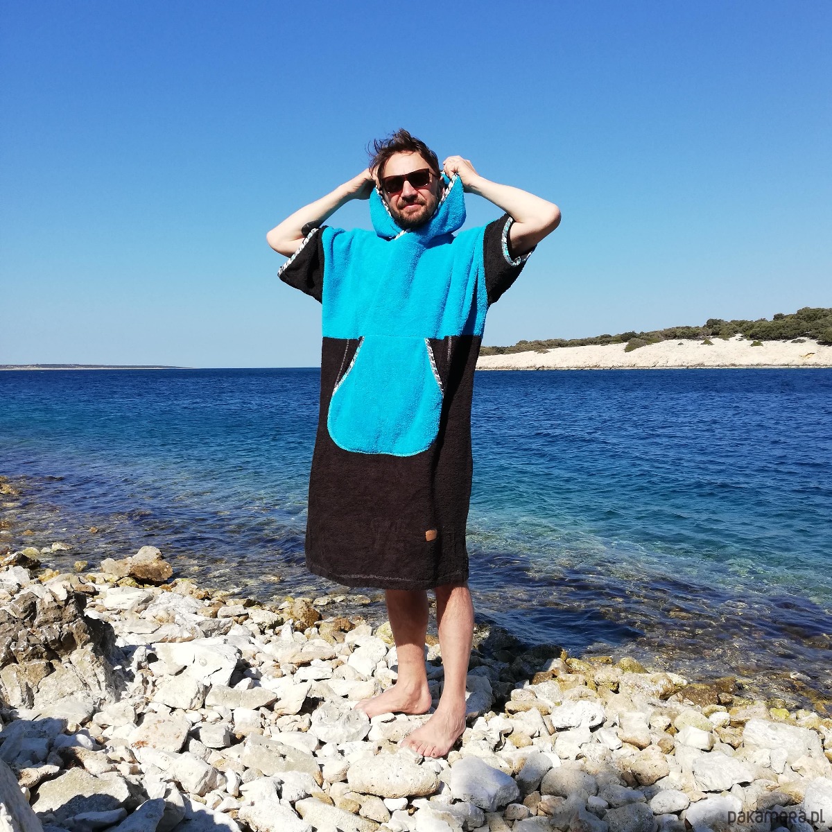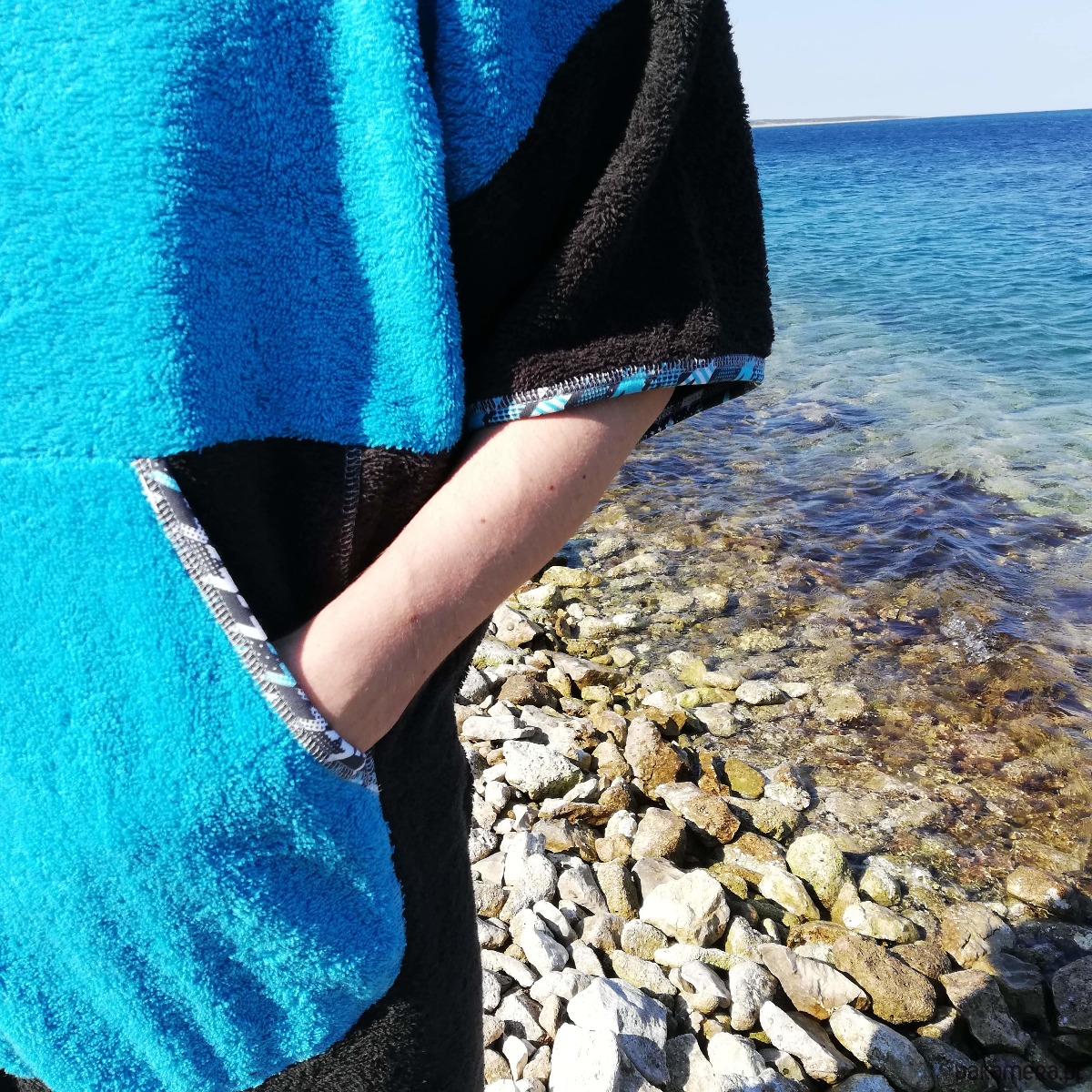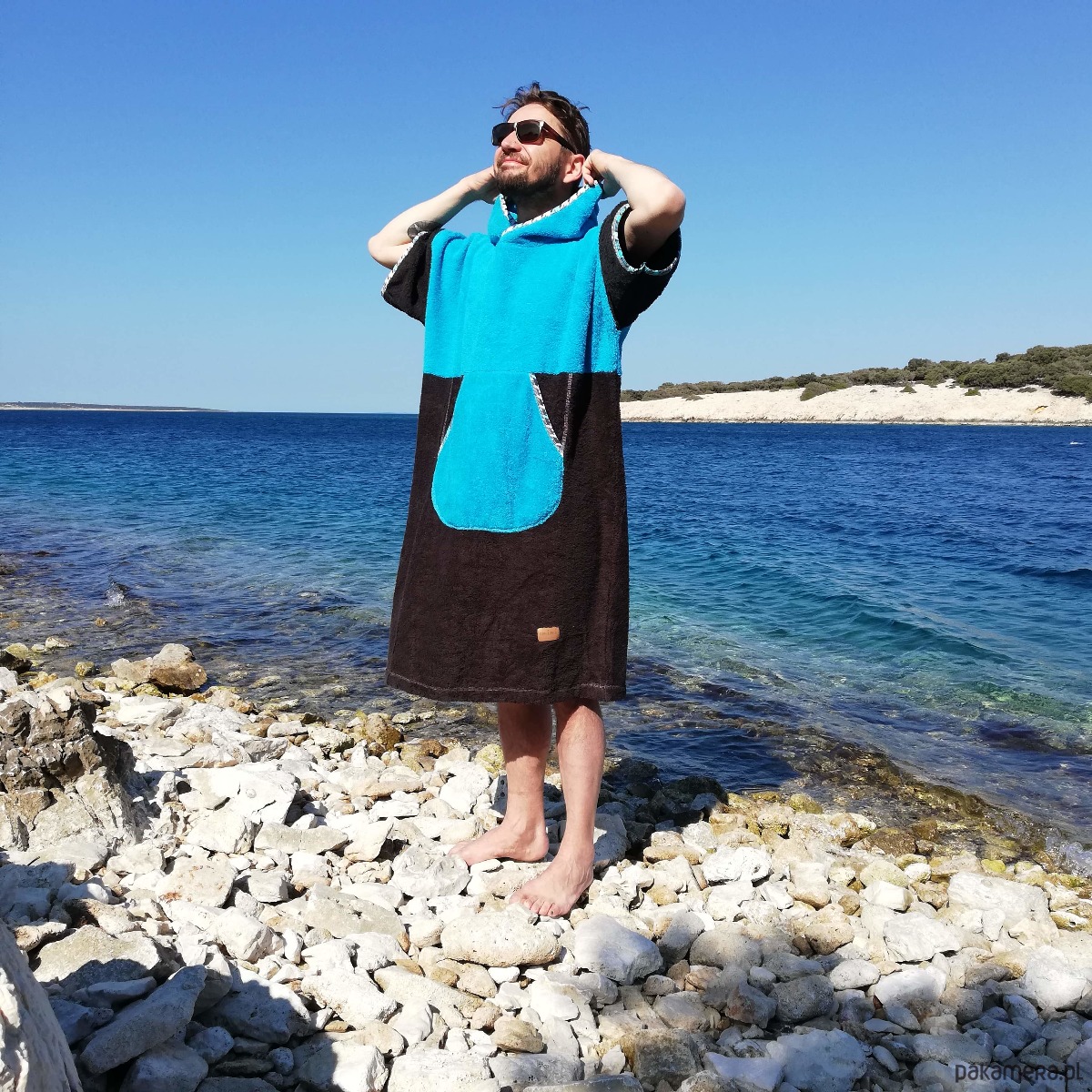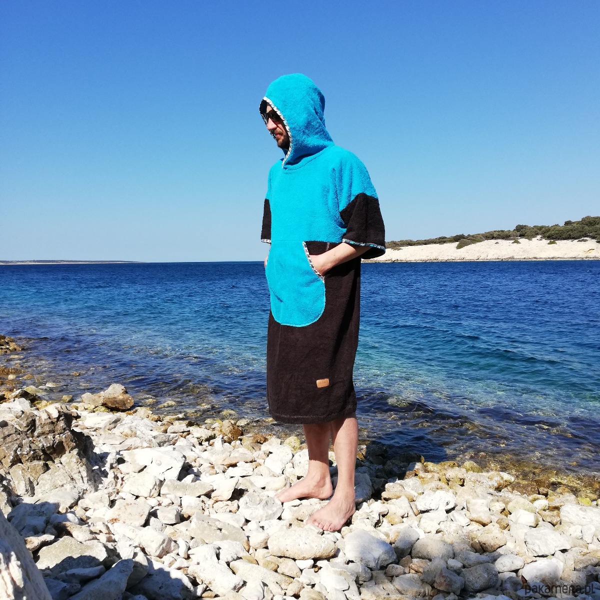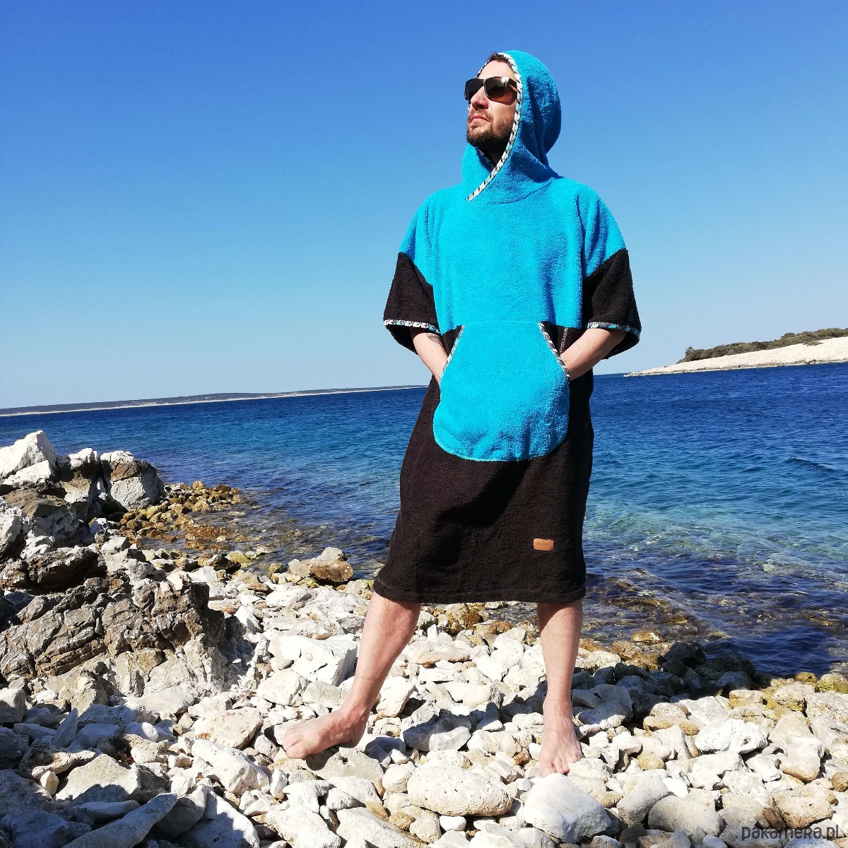 Surf Poncho – Blue Sky, to oryginalne i funkcjonalne ubranie specjalnie zaprojektowane dla moich przyjaciół surferów i morsów :-). Umożliwia swobodną zmianę garderoby po surfowaniu na desce lub morsowaniu w lodowatych akwenach wodnych. Doskonale sprawdzi się też na plaży lub basenie zamiast szlafroka. Każde poncho wykonane jest ręcznie z najwyższej jakości bawełny typu frotte. Tkanina jest naturalna, ciepła i bardzo łatwo absorbuje wodę, ponieważ wyprodukowana jest w 100 % z włókien bawełnianych.