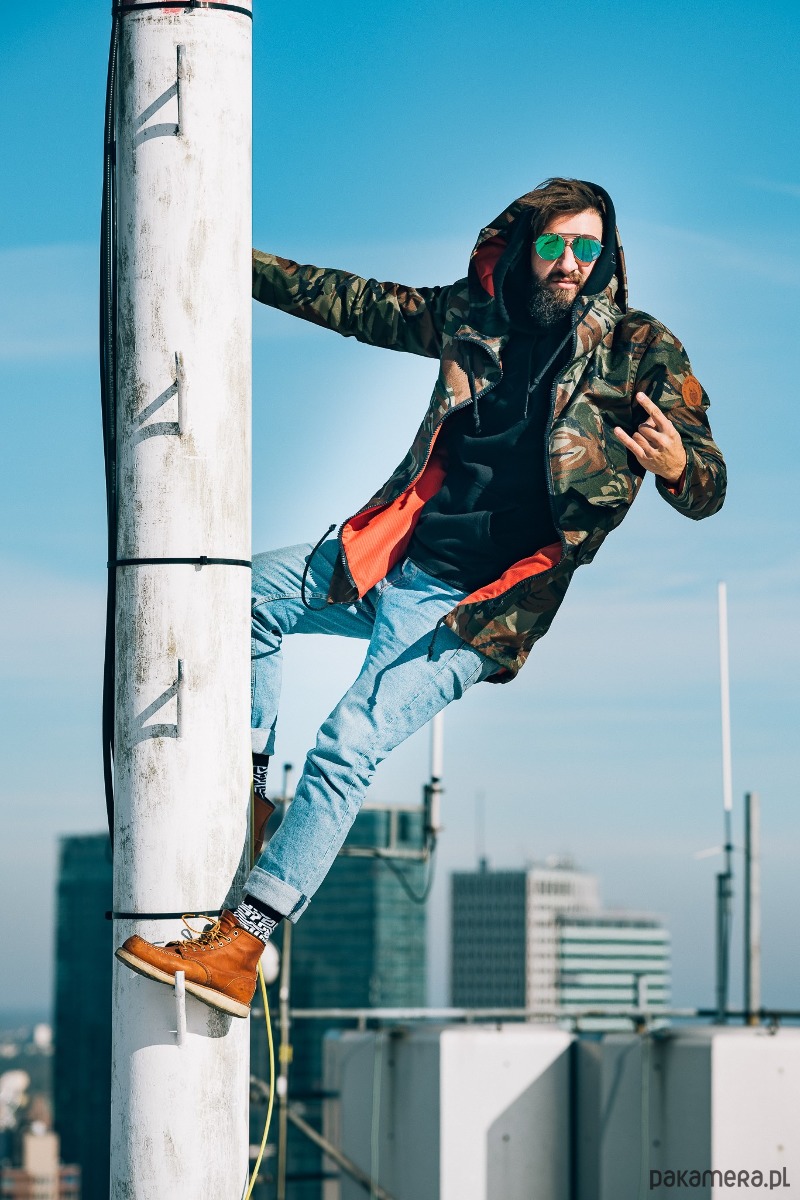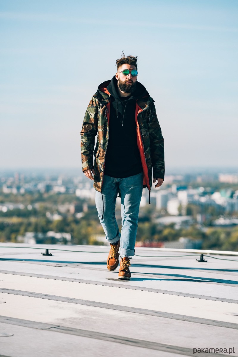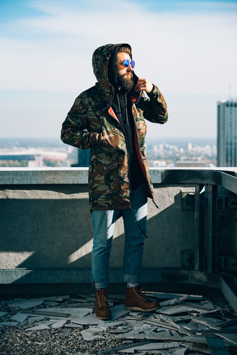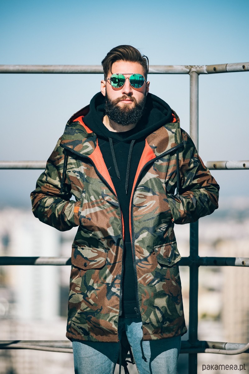Wodoodporna parka moro z czerwoną podszewką. Już teraz nie wykręcisz się z wizytą u dziewczyny z powodu deszczu! Elegancko skrojona, z dużym kapturem i wygodnymi kieszonkami. Polecamy ją - u nas każdy w zespole ją nosi (nawet dziewczyny!).