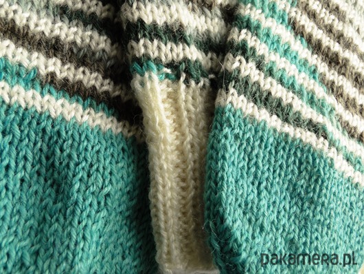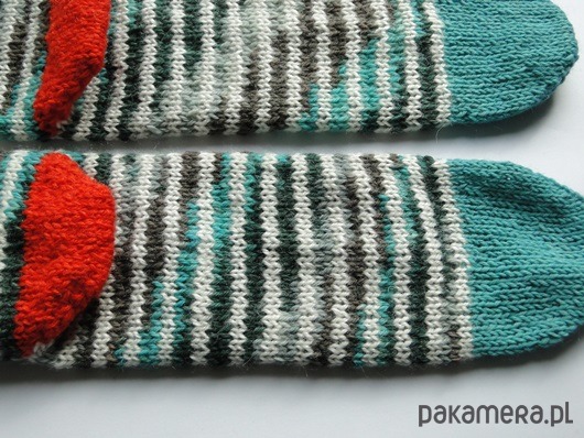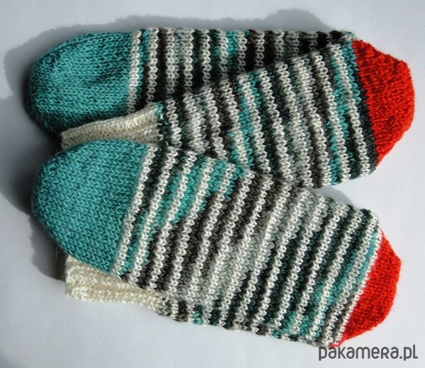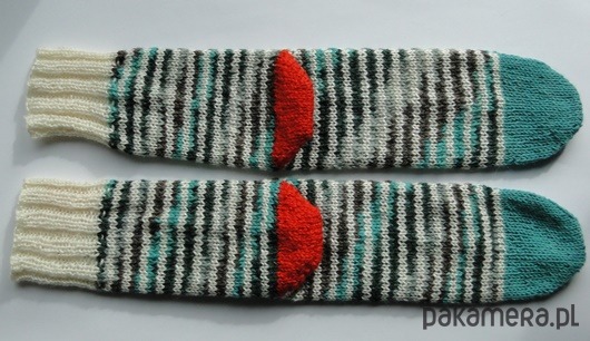 Wykonane na drutach z mięciutkiej i ciepłej włóczki (mieszanka wełny, bawełny i akrylu). Kolor to melanż jesiennych barw zieleni szarości oraz biały. Pięta w kolorze intensywnej pomarańczy.