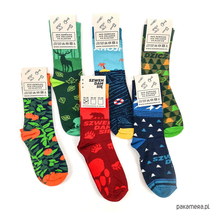 Skarpetki Szwendam się uszyto w Polsce, dlatego charakteryzuje je wysoka jakość i duża dbałość o detale. Są miękkie i przyjemne w dotyku, a do tego wytrzymałe. Dzięki zastosowanym materiałom idealnie przylegają do stóp. Delikatne i bezuciskowe ściągacze mocno trzymają się nóg i zapobiegają zsuwaniu skarpet w dół. Skarpety Szwendam się są niezwykle wygodne, gdyż posiadają niewyczuwalne i płaskie szwy na palcach. Zabawne skarpetki to świetny dodatek do codziennego, miejskiego ubioru, jak i ciekawa alternatywa na wycieczki. W naszych skarpetkach bezuciskowych mogą chodzić kobiety i mężczyźni (skarpetki męskie, skarpetki damskie).