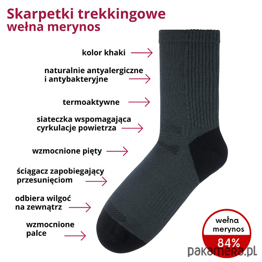 Doskonałe skarpetki w góry i na leśne szlaki. Ciepłe skarpetki z merynosa. Na chłodniejsze dni . Doskonały "termofor" dla stóp, rozgrzeje stopę; kiedy jest gorąco - ochłodzi. Wełna z merynosa reguluje środowisko skóry, zapewniając jej, jak najlepsze warunki do oddychania.