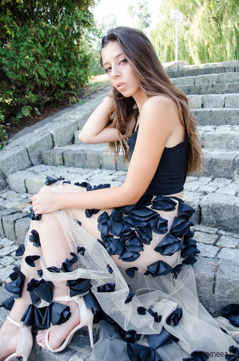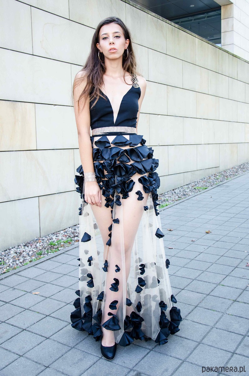 Sukienka wykonana z cielistego tiulu zdobionego ręcznie wycinanymi płatkami. Z przodu głeboki dekolt, który jest zszyty niewidocznym tiulem - nic nie przesunie się w trakcie noszenia. Dodatkowo wewnątrz są wszyte komfortowe miseczki, które dodają stabilności i pięknie modelują sylwetkę. Z tyłu zamek kryty, z tyłu dekolt V do łopatek. Na ramionach jest wszyta złota taśma. Jest możliwość zmiany koloru lub modyfikacji - na zamówienie możemy wszyć zwykłe ramiączka lub wszyć podszewkę w całą spódnicę itp . W spódnicy pod płatkami na kształt zdobienia jest wszyta krótka cielista halka. Na dole bogate zdobienie, które zbiega się się symetrycznie z górą. Sukienka jest mocno dopasowana, posiada zaszewki, w talii jest złoty ozdobny pasek.