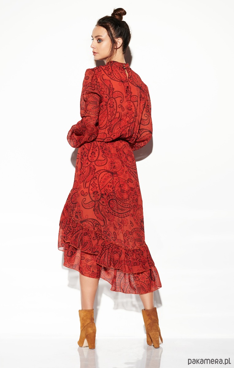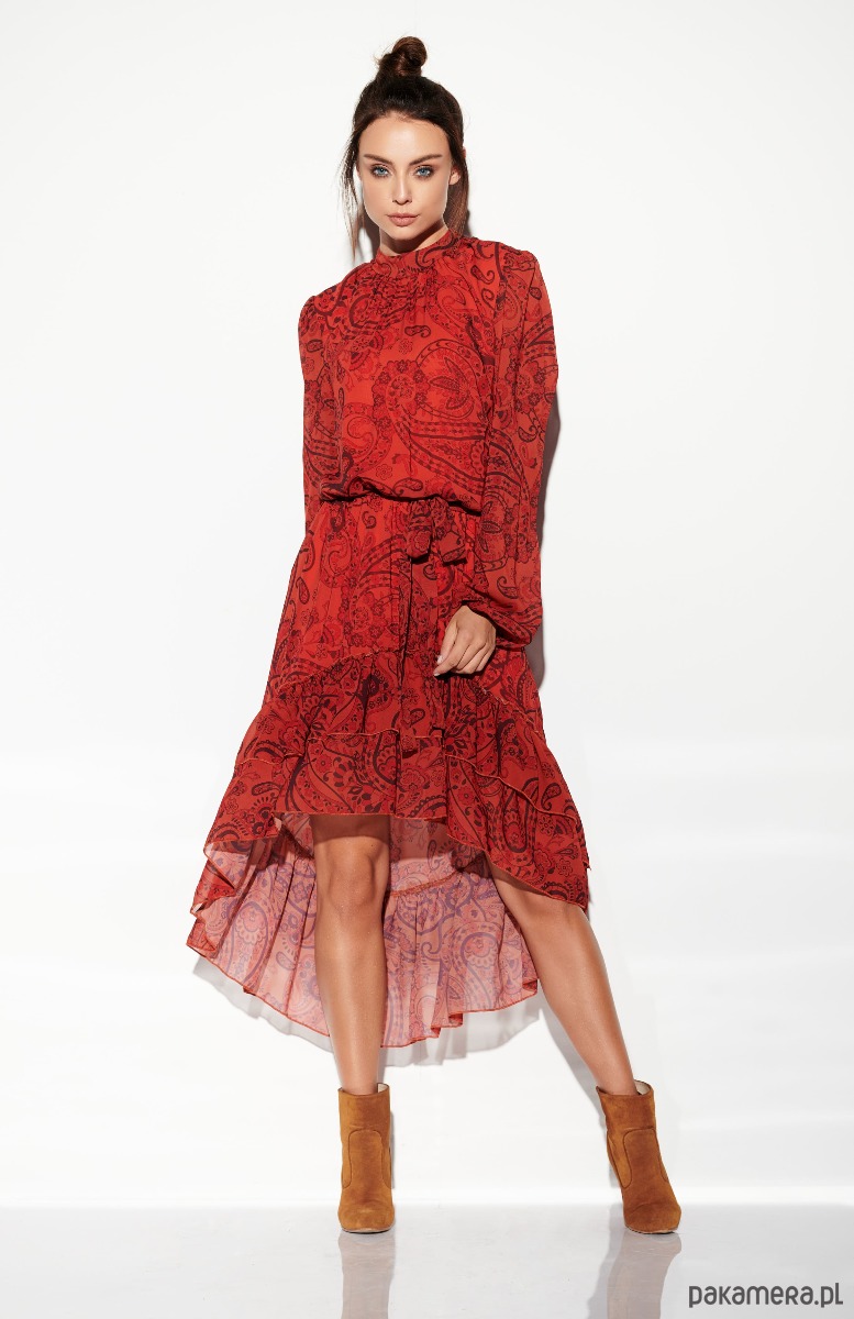 Mocne wzory, krótszy przód i dłuższy tył to główne cechy tej sukienki. Idealnie wpasowuje się w obecne trendy, można nosić ją zarówno w miejskich stylizacjach jak i bardziej eleganckich.