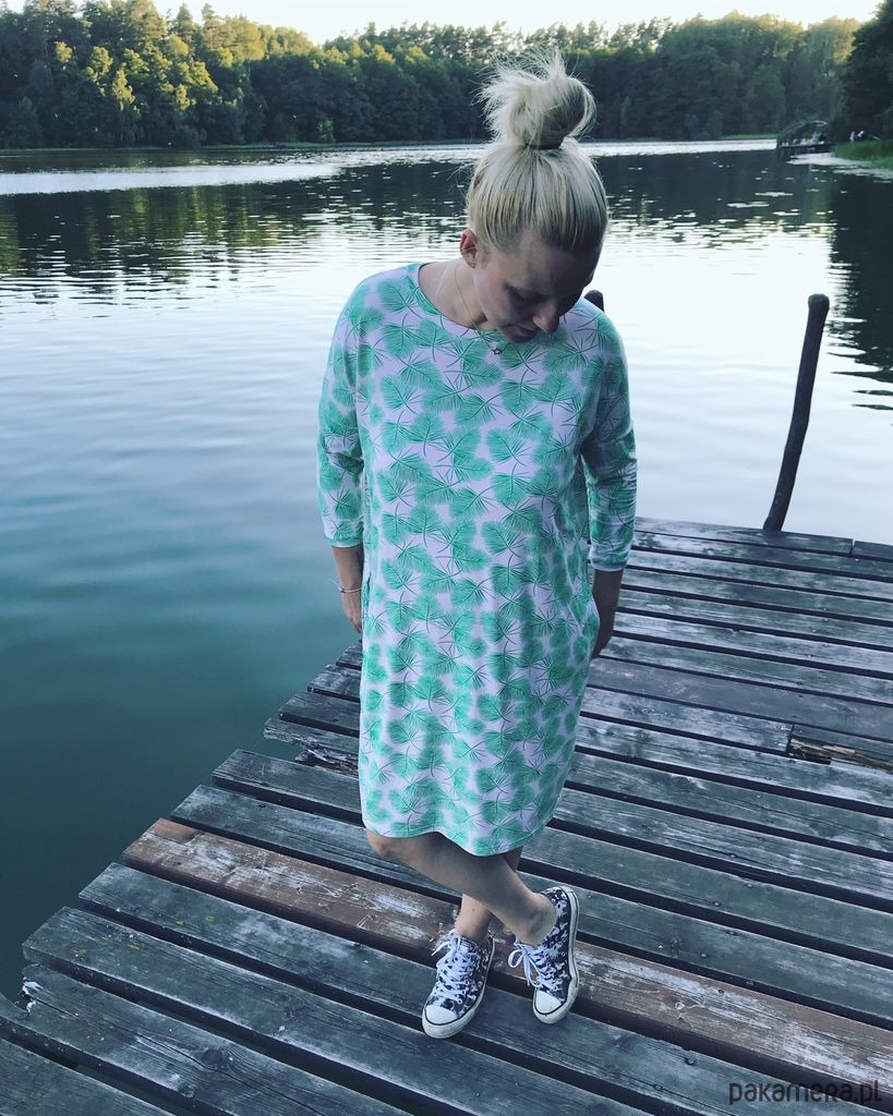 Sukienka o fasonie oversize’owej koszulki – posiada 3/4 rękawy o obniżonym szwie ramion oraz zabudowany dekolt wykończony ściągaczem. Uszyta z bladoróżowej dzianiny o wzorze zielonych liści palm. Prosty fason sprawia, że to idealna propozycja do codziennych stylizacji. Bardzo wygodna. Dostępna w rozmiarach: S, M i L.