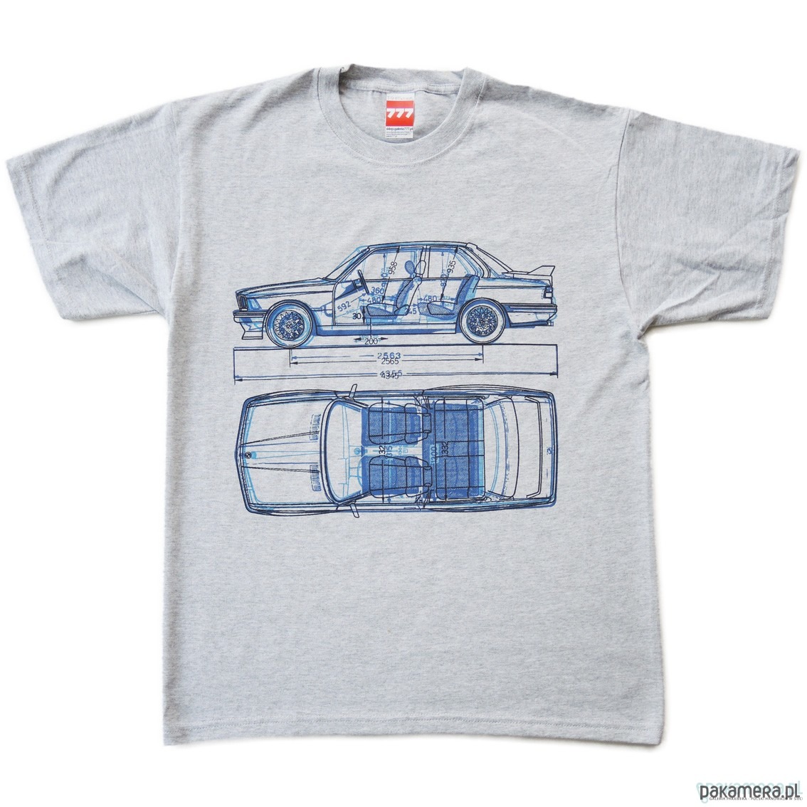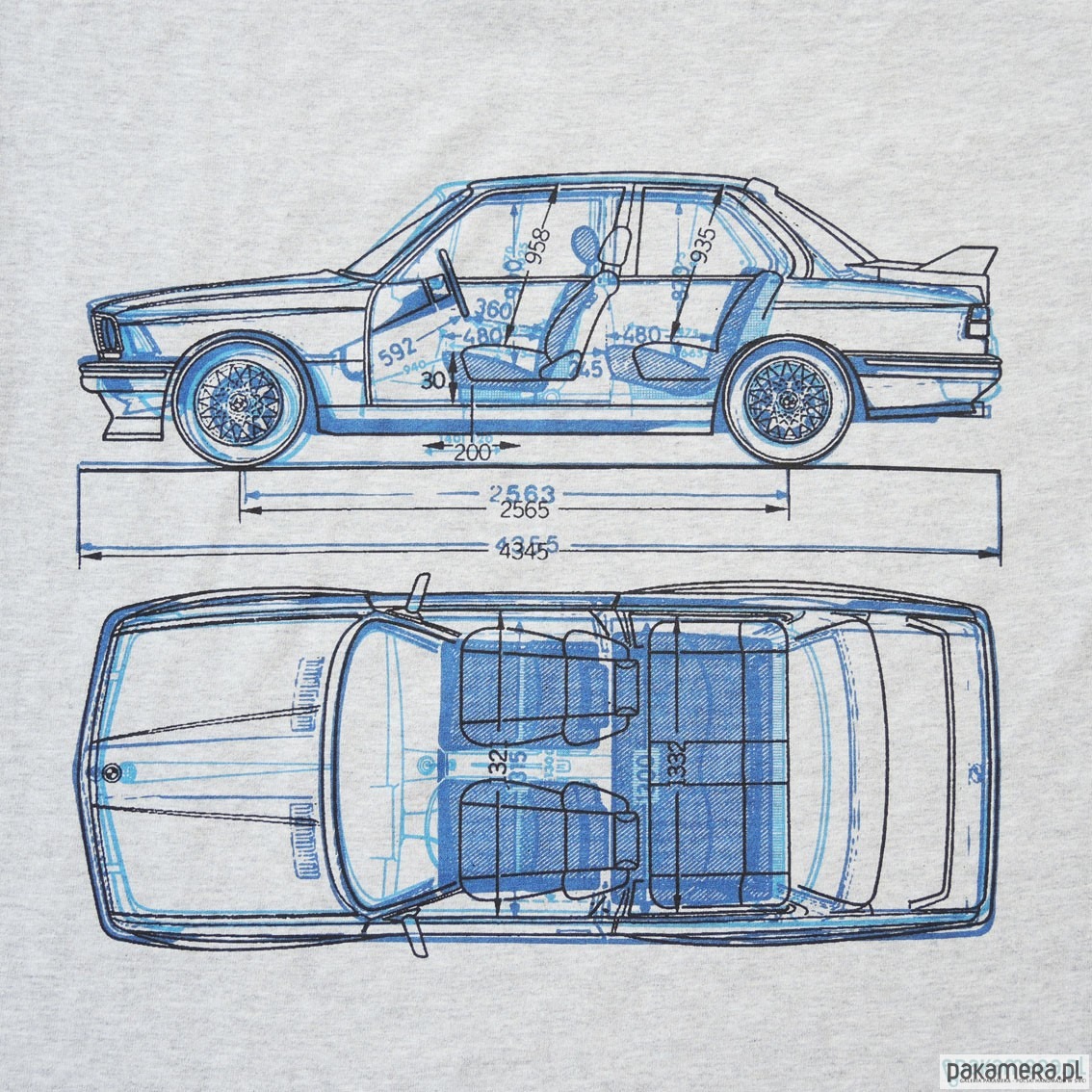 Krótka historia początków BMW serii 3 - od protoplasty (BMW 1602) przez E21 po M3 E30. Teraz także na szarej koszulce. Delikatny w dotyku, trwały nadruk na koszulce 100% bawełny, gramatura 165 g. Projekt: 777.