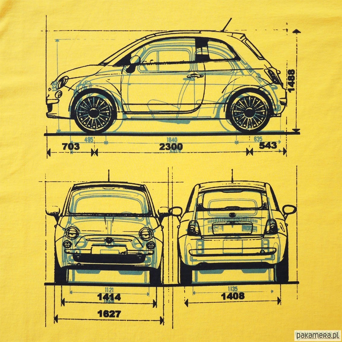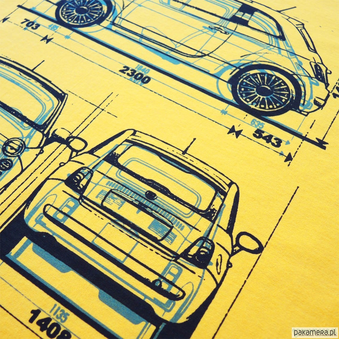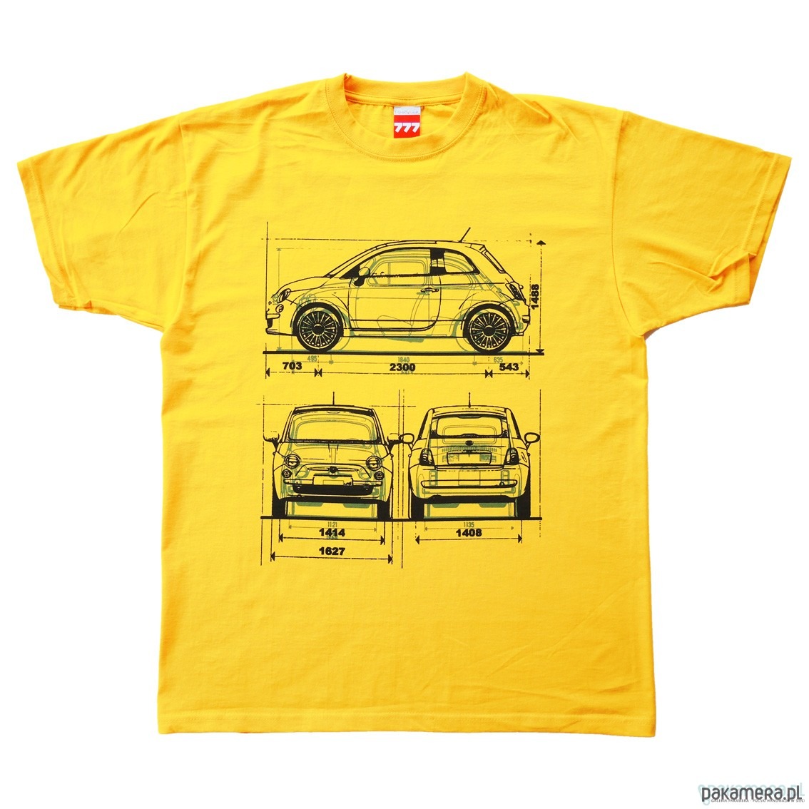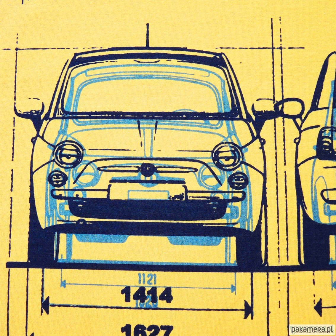 Współczesny Fiat 500, a w tle jego dużo starszy i mniejszy brat. Delikatny w dotyku, trwały nadruk na żółtej koszulce 100% bawełny, gramatura 160 g. Projekt: 777.