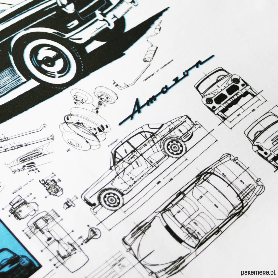 Volvo Amazon – nie dość, że piękne i praktyczne, to jeszcze w rajdach dawało radę :). Produkowane w latach 1956-1970. Tu w najbardziej popularnej, czterodrzwiowej wersji – w razie czego z zestawem części zamiennych. Delikatny w dotyku, trwały czarno-błękitny nadruk na białej koszulce 100% bawełny, gramatura 160 g. Projekt: 777.