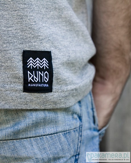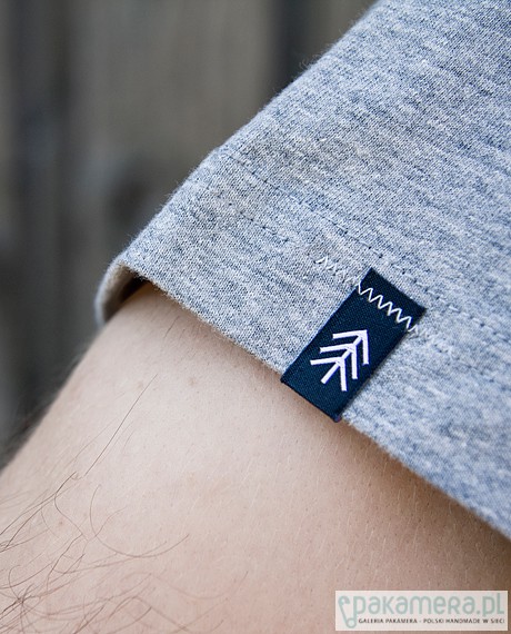 T-shirt bawełniany w kolorze szarym (melanż). Nadruk wykonany ręcznie techniką sitodruku farbą wodną w kolorze czarnym. Dodatkowo nadruk z parametrami prania wewnątrz na karku oraz dwie metki. Gramatura: 185g