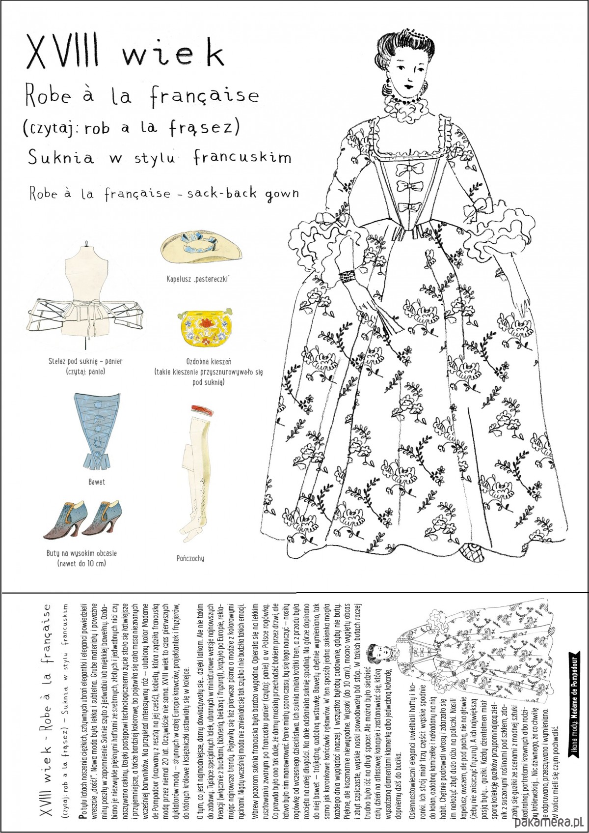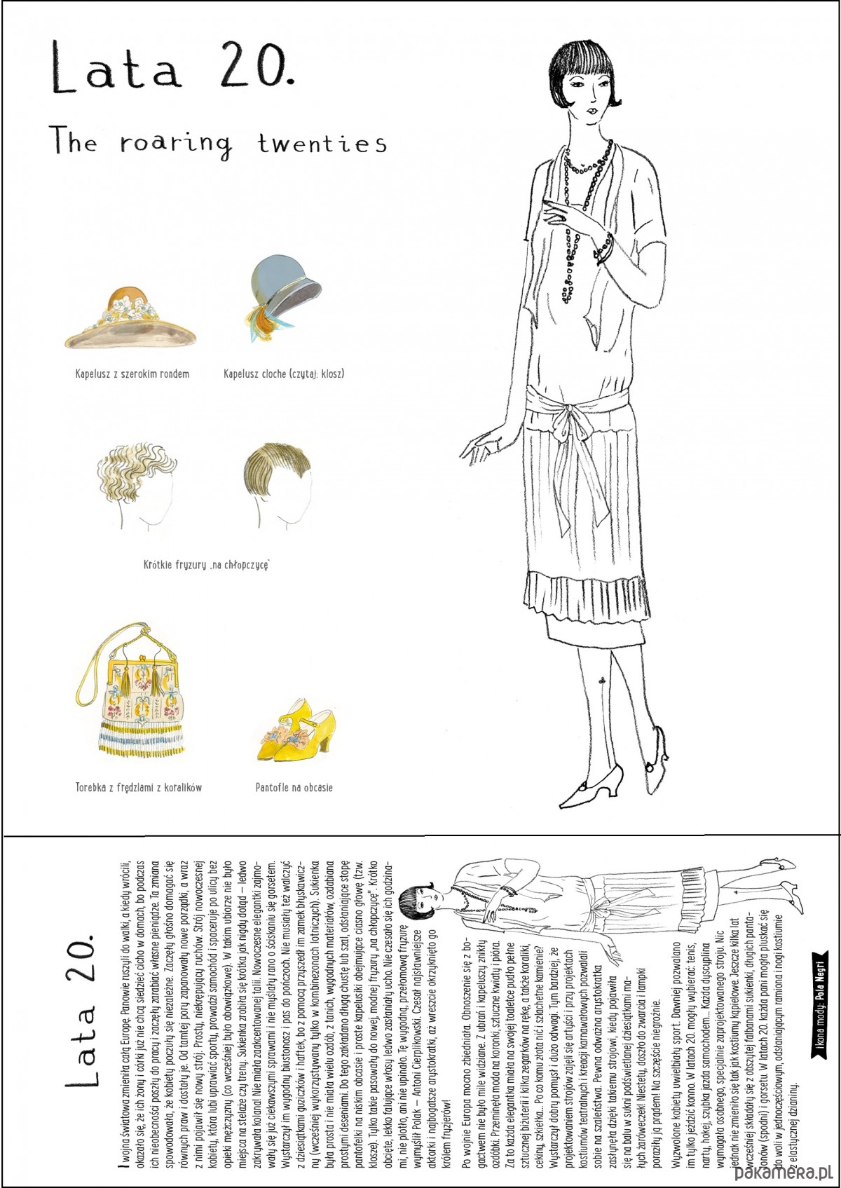 W teczce inspiracji MODA znajdziesz 15 kart ze strojami z 15 modowych epok. Na każdej stronie umieściliśmy nazwisko ikony mody, czyli osoby, której kreacje w danej epoce stały się inspiracją i wzorem do naśladowania. Zadaniem jest pokolorowanie wszystkich strojów i doklejenie pasujących dodatków. Dolną część każdej karty (z opisem stroju) należy oderwać, a następnie związać wszystkie elementy wstążką dołączoną do teczki. W ten sposób powstanie książeczka w formie wachlarza.