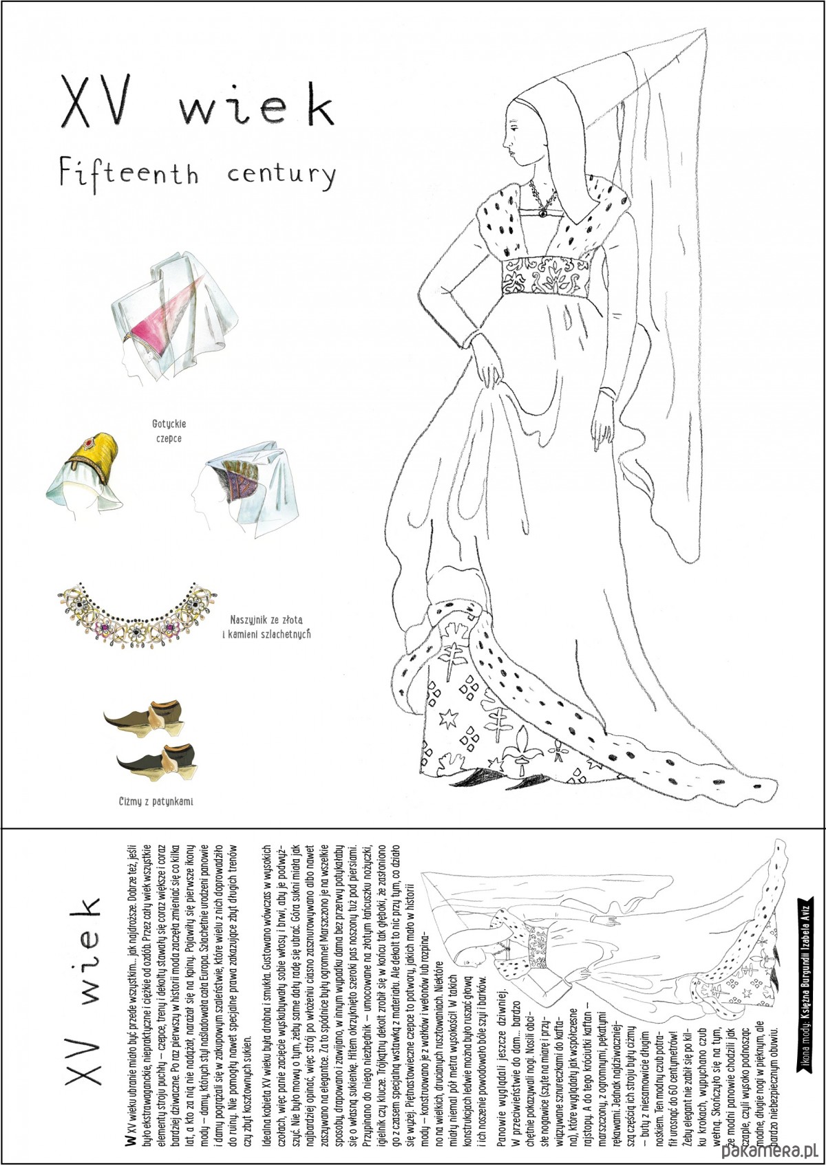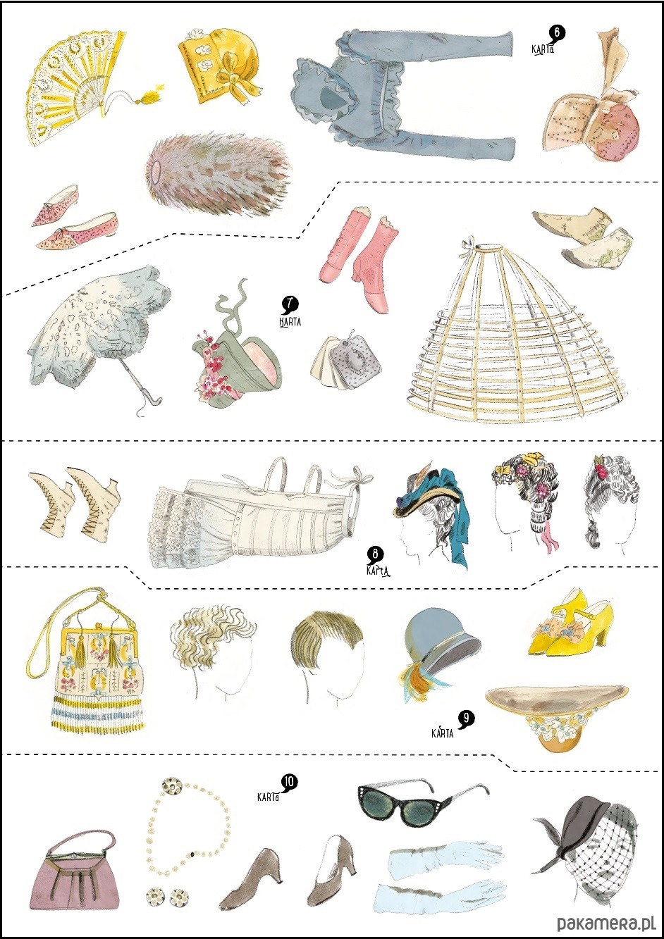 Po drugiej stronie każdej karty – wzór tkaniny lub biżuteria z epoki do pokolorowania