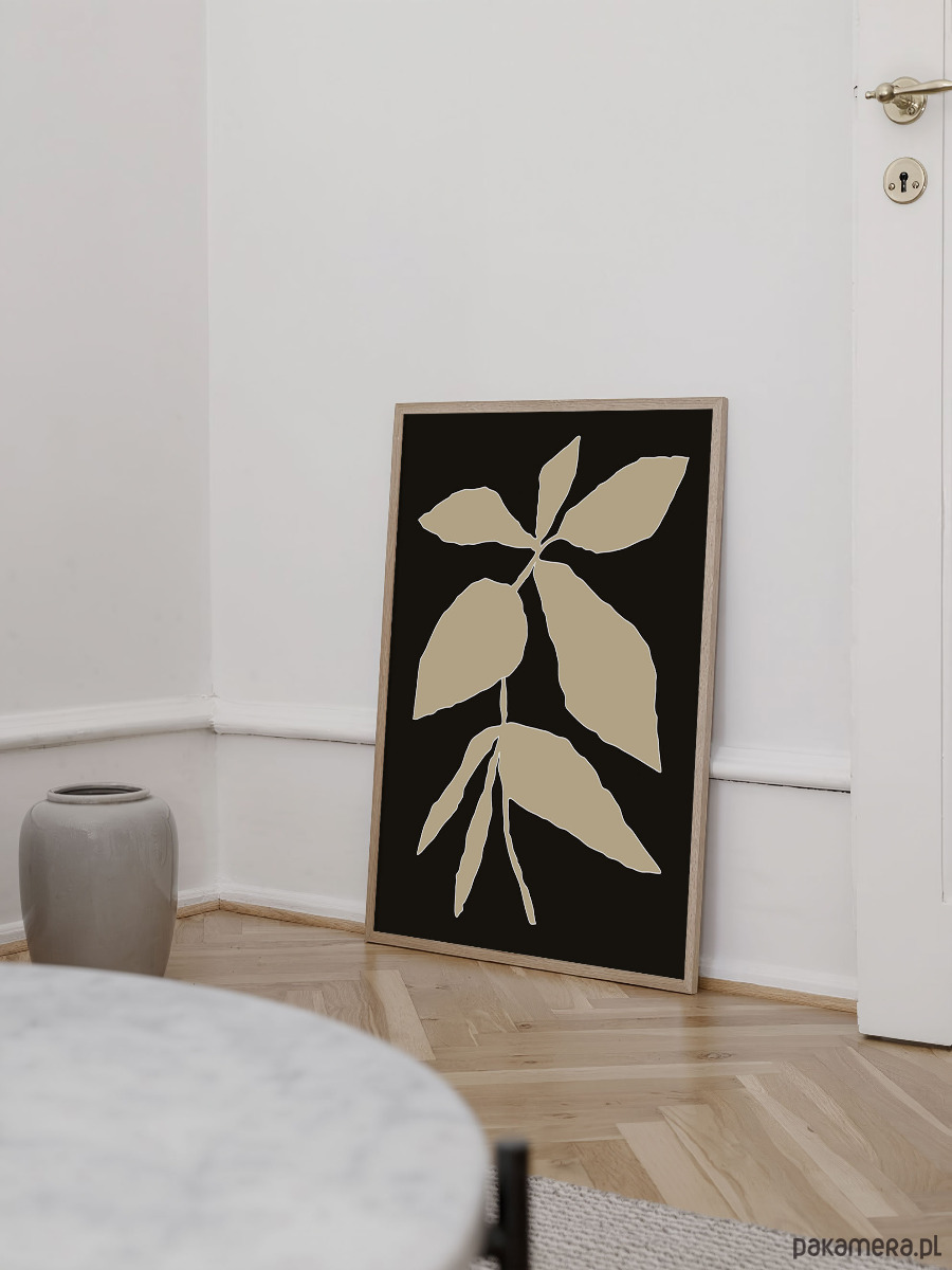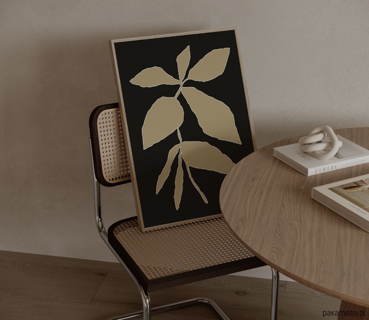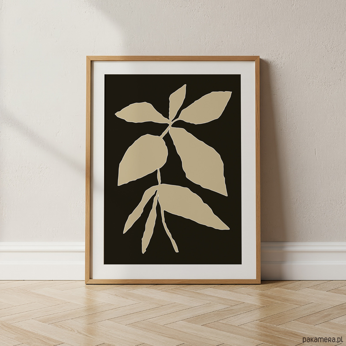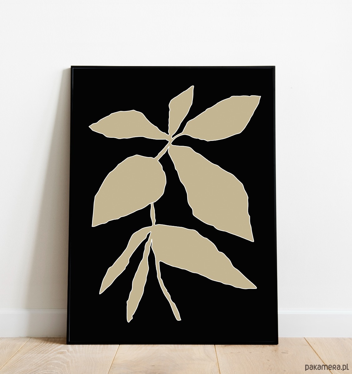 Minimalistyczny plakat abstrakcyjny z uproszczonym motywem botanicznym w ciepłych odcieniach beżu na głębokim, czarnym tle. Kontrastowa kolorystyka i prosta forma sprawiają, że grafika jest wyrazista, a jednocześnie elegancka i łatwa do dopasowania do wnętrza.
