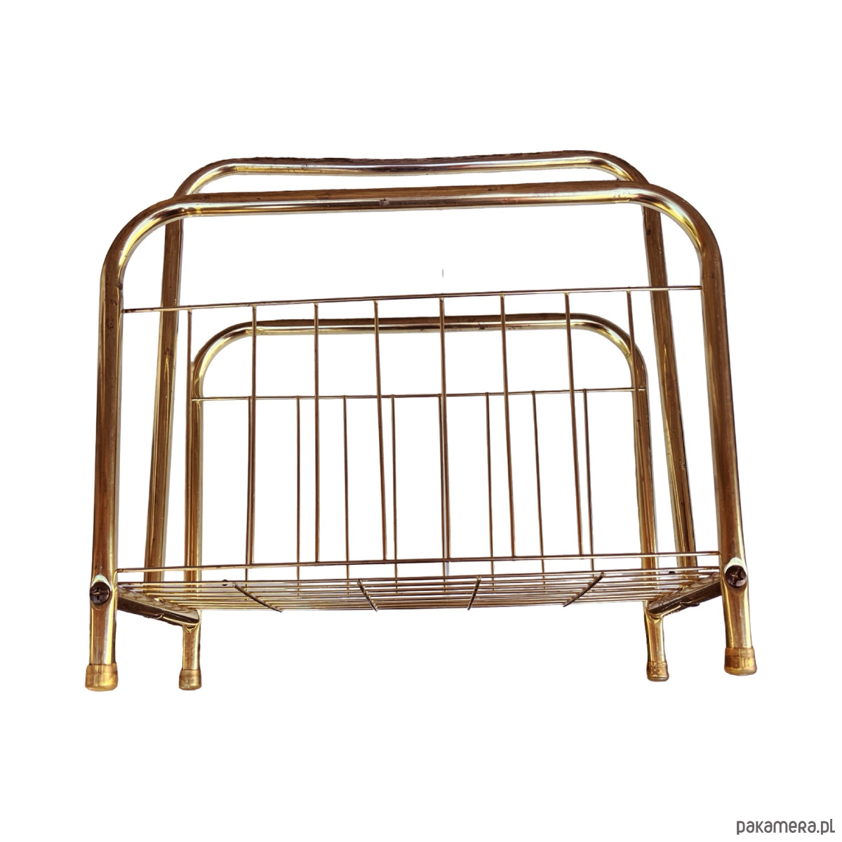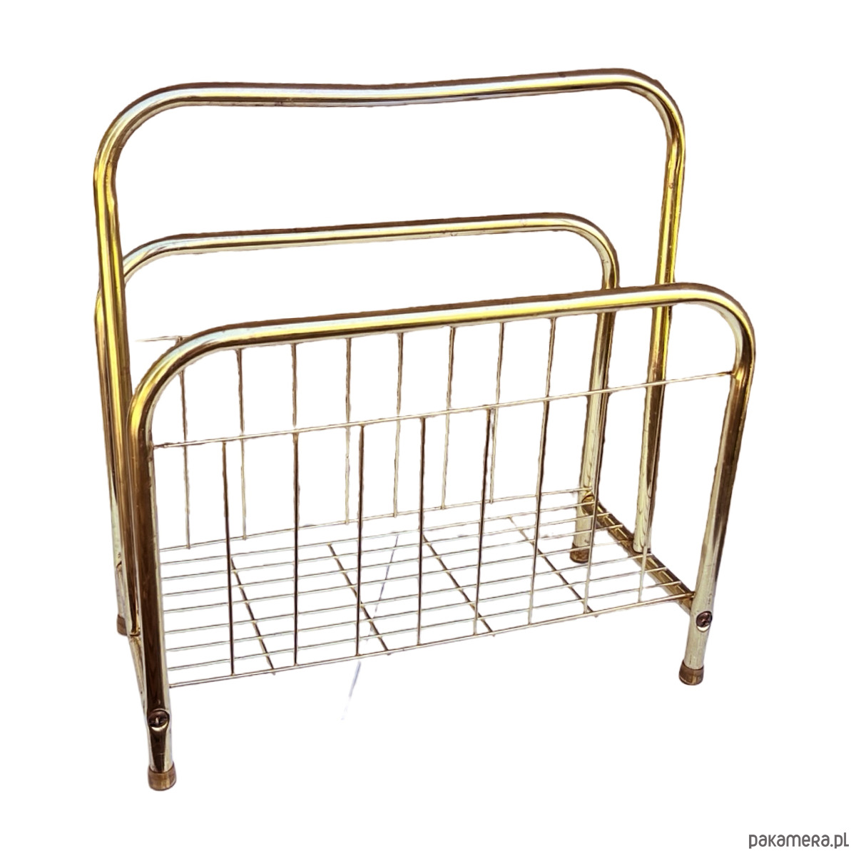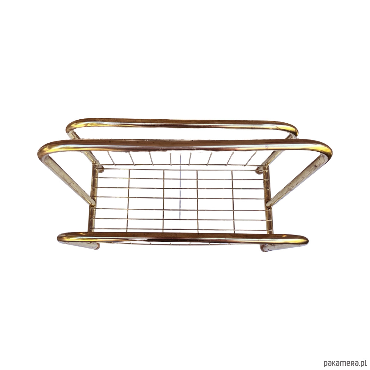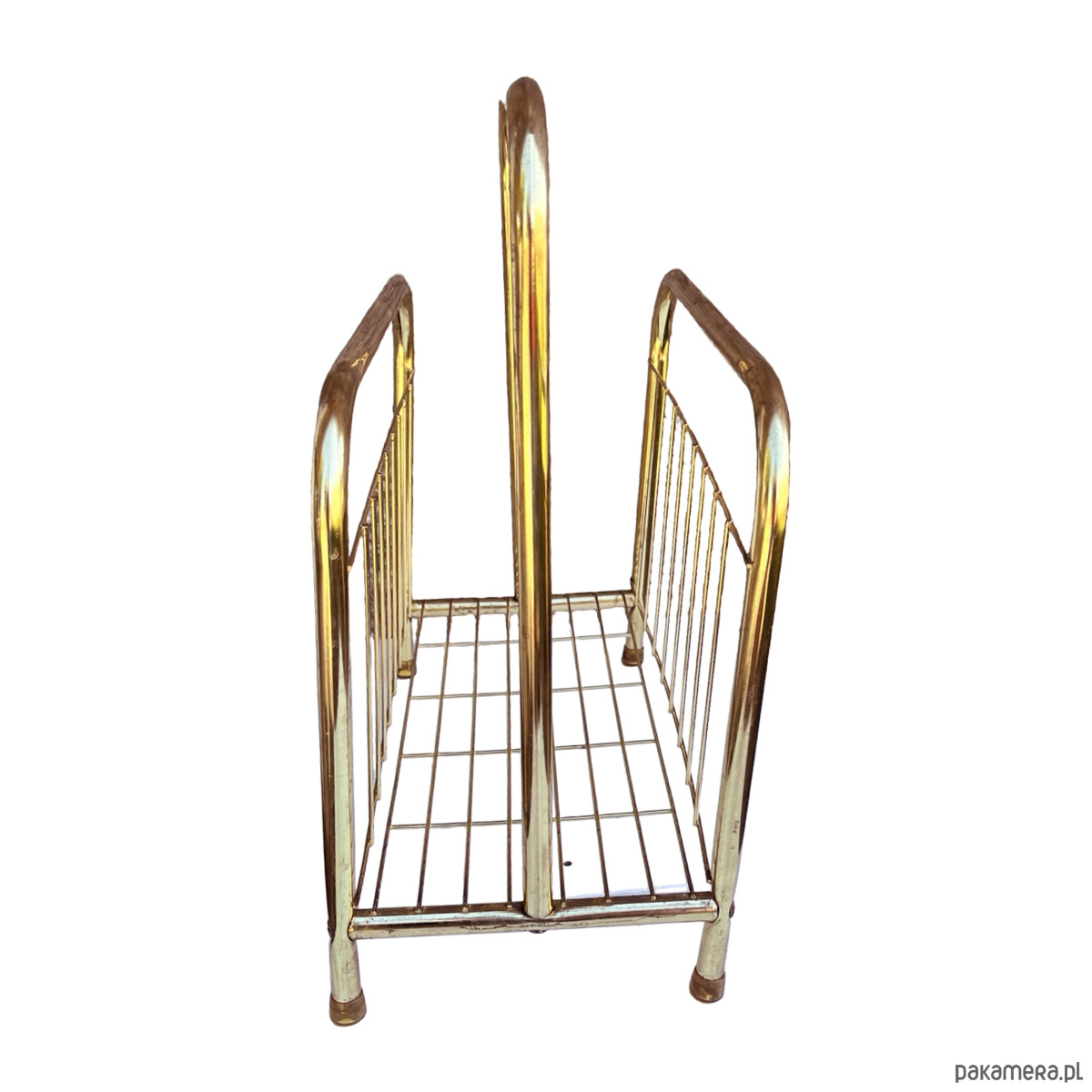 Stylowy gazetnik modernistyczny wykonany w Belgii w latach 80. XX wieku. Konstrukcja z metalowych rurek w kolorze złotym nadaje mu elegancji i lekkiego, przestrzennego charakteru.