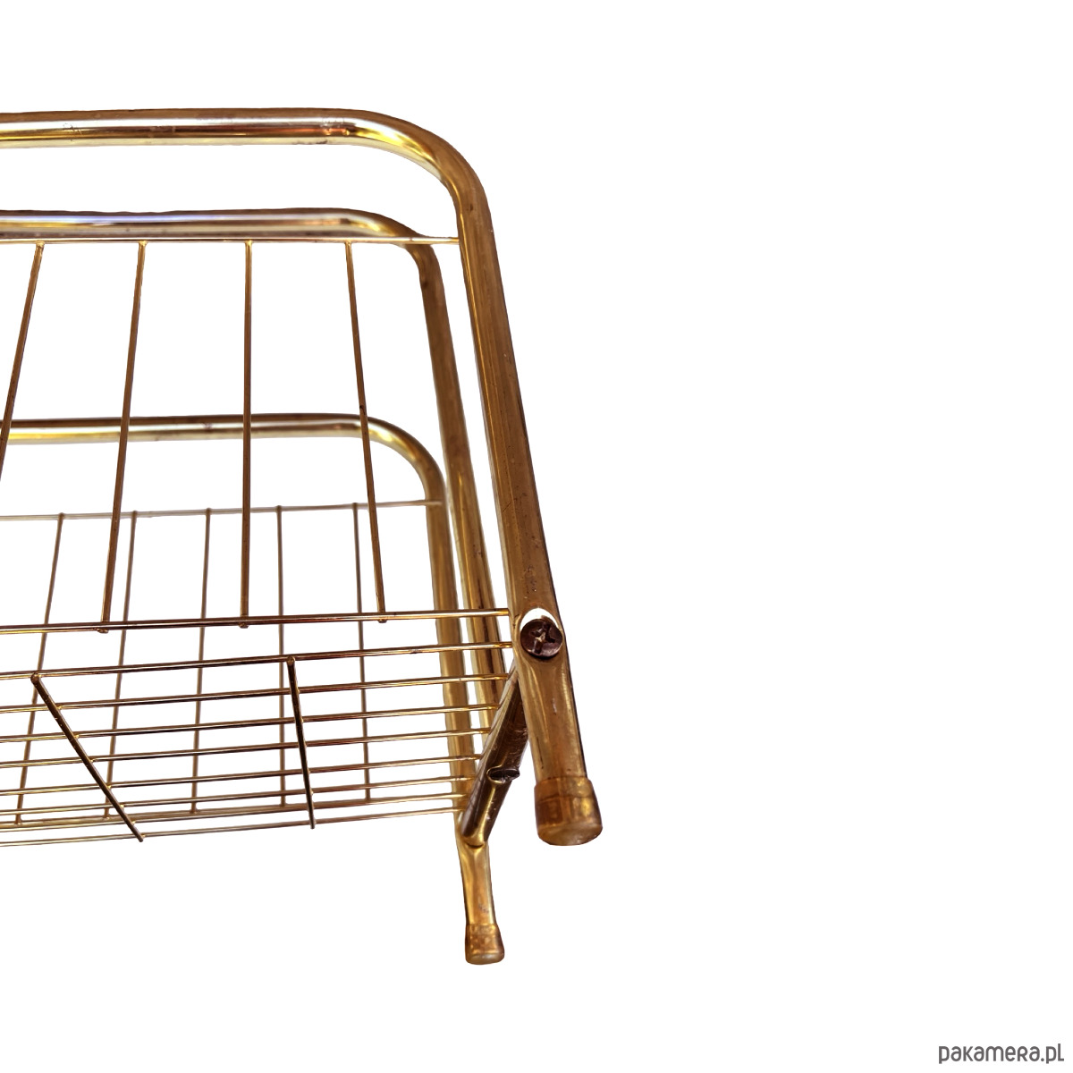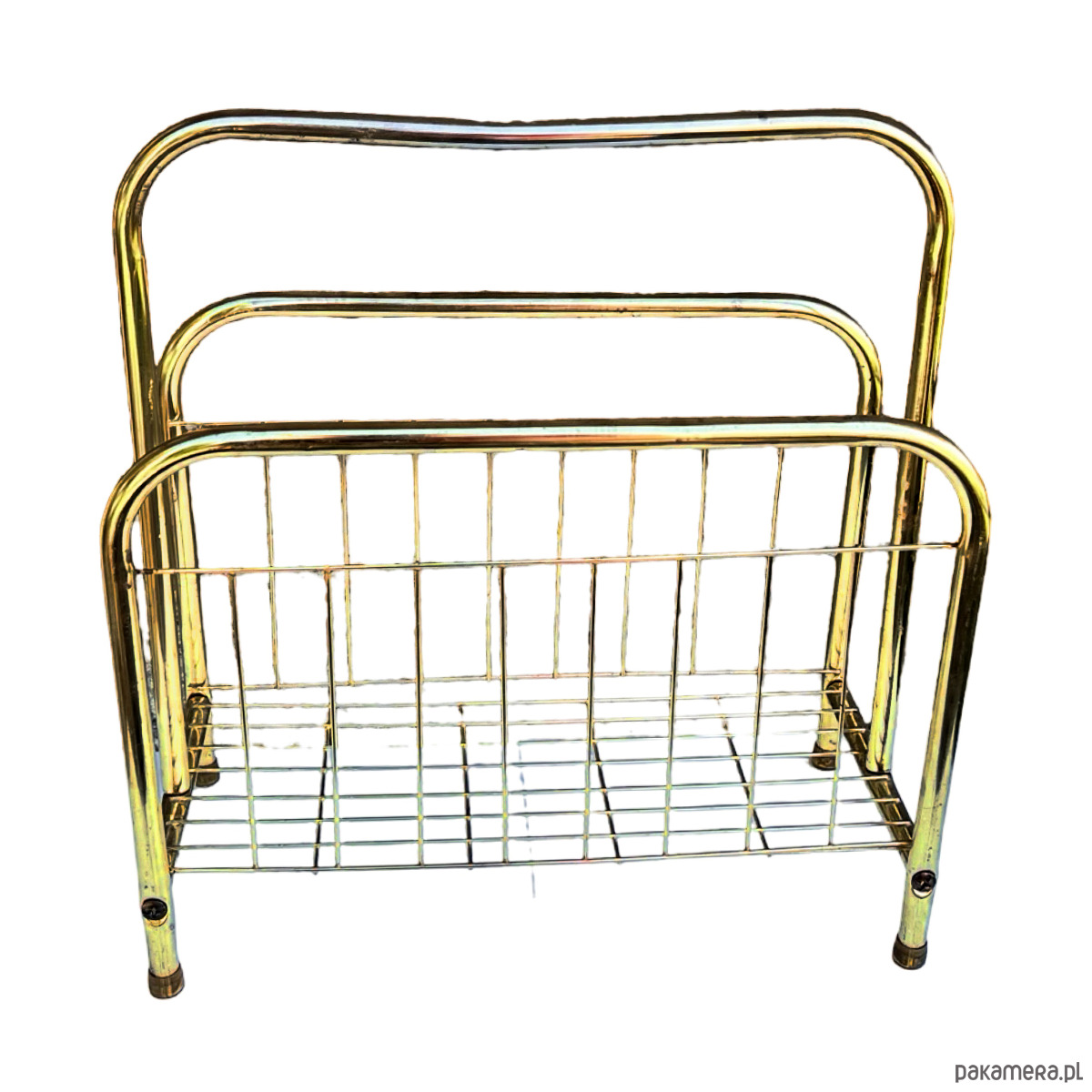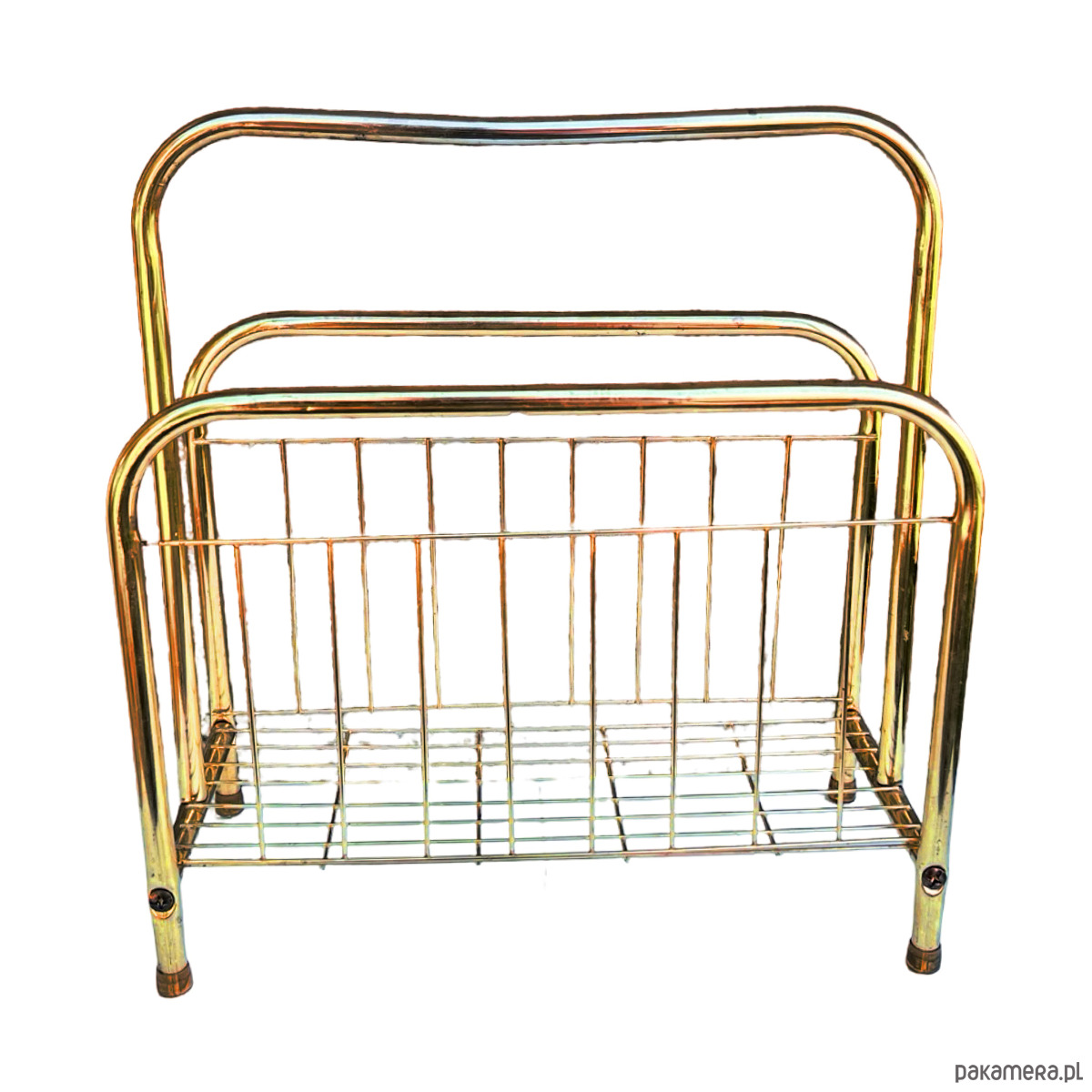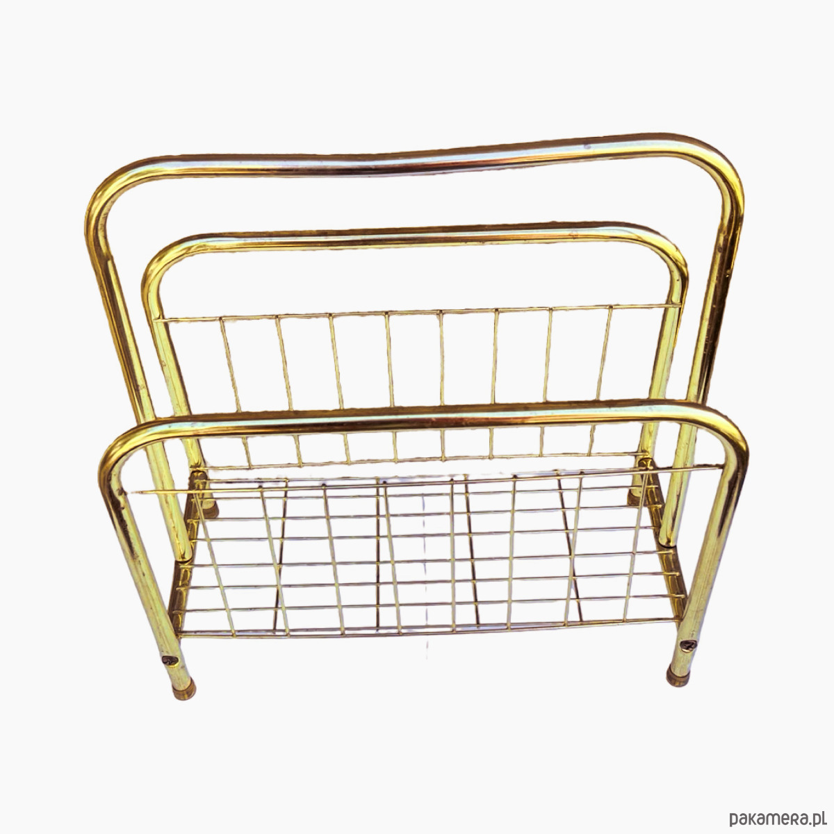 Stylowy gazetnik modernistyczny wykonany w Belgii w latach 80. XX wieku. Konstrukcja z metalowych rurek w kolorze złotym nadaje mu elegancji i lekkiego, przestrzennego charakteru.