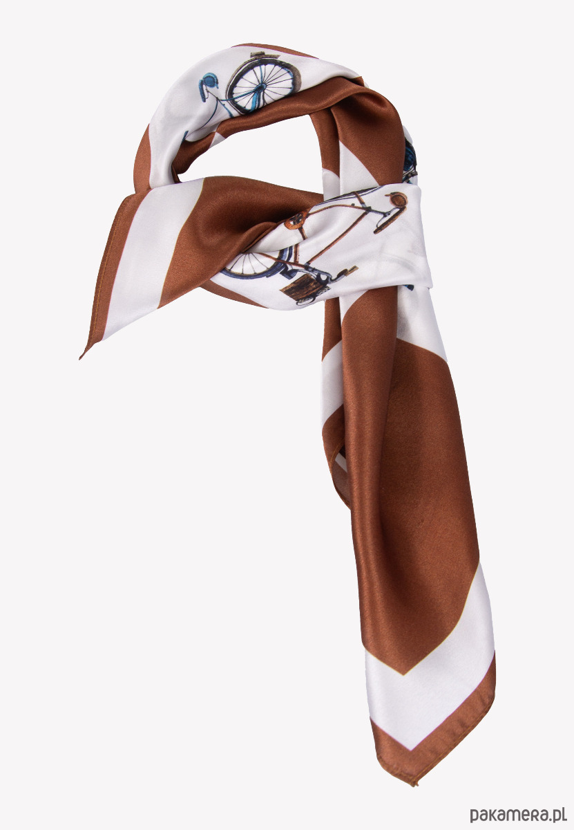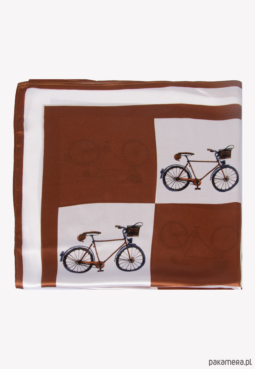 Modna apaszka damska jedwabna brązowa z motywem rowerów 68 cm x 68 cm