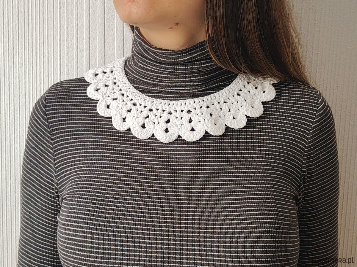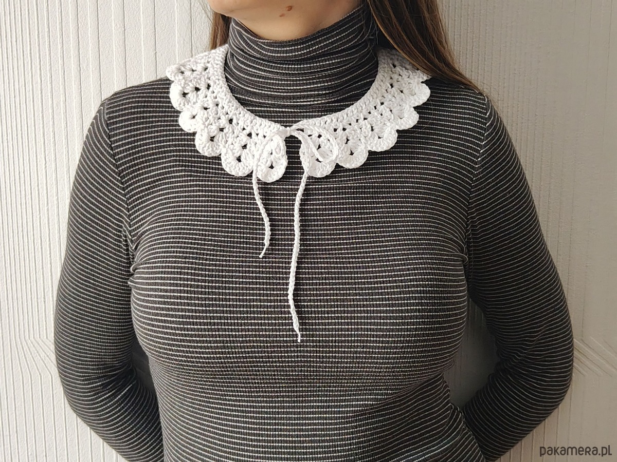Stylowy koronkowy kołnierzyk wykonany ręcznie z włóczki na szydełku.