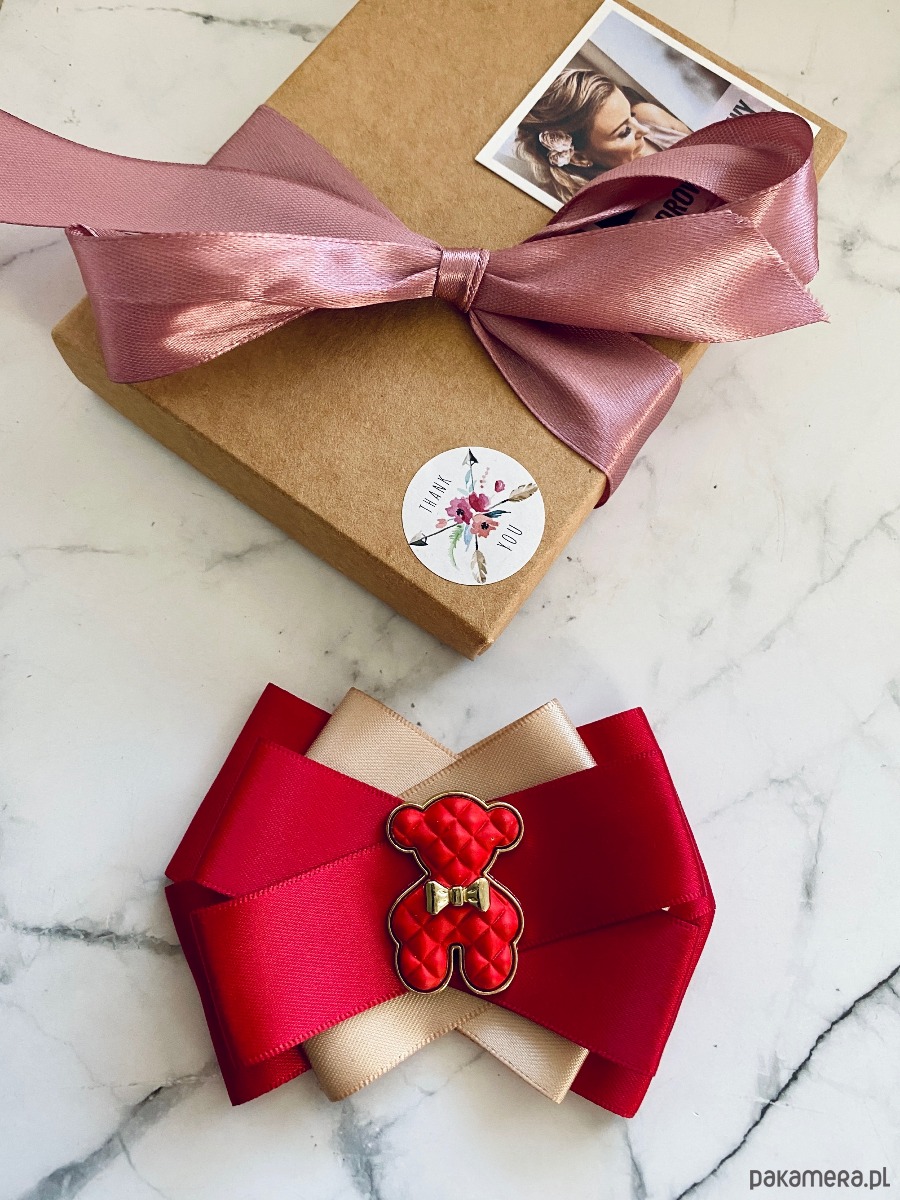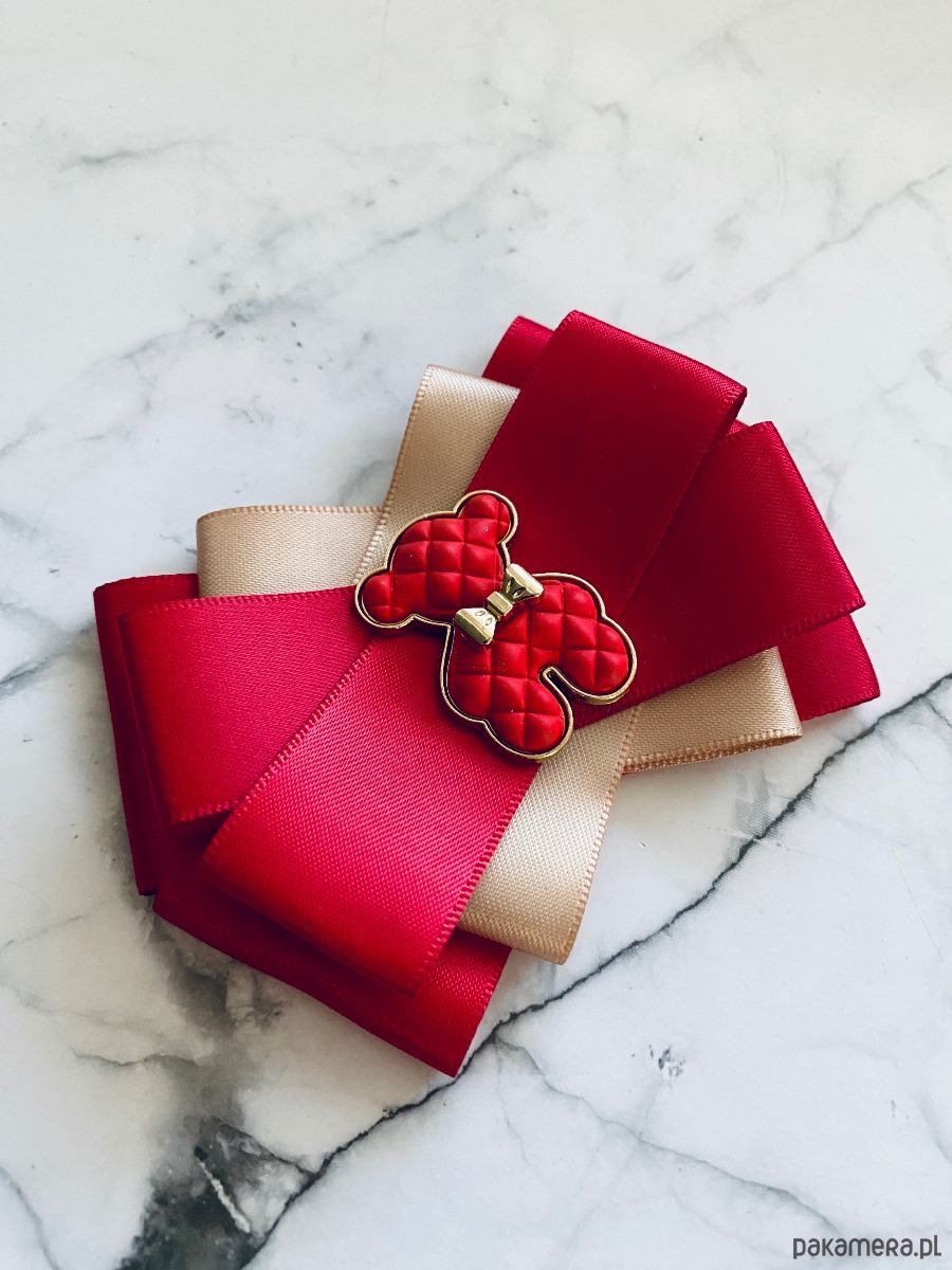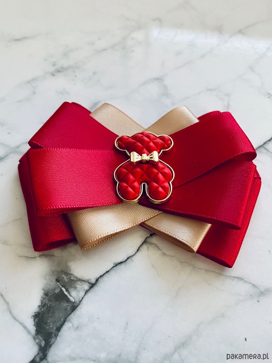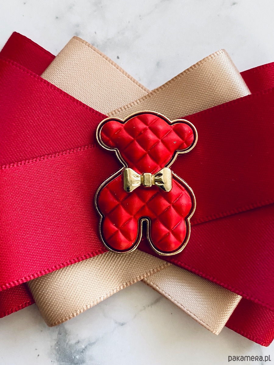 Cudowny Miś wykonany z ciekawej kratkowanej masy w kolorze czerwonym z urocza złota kokardka.