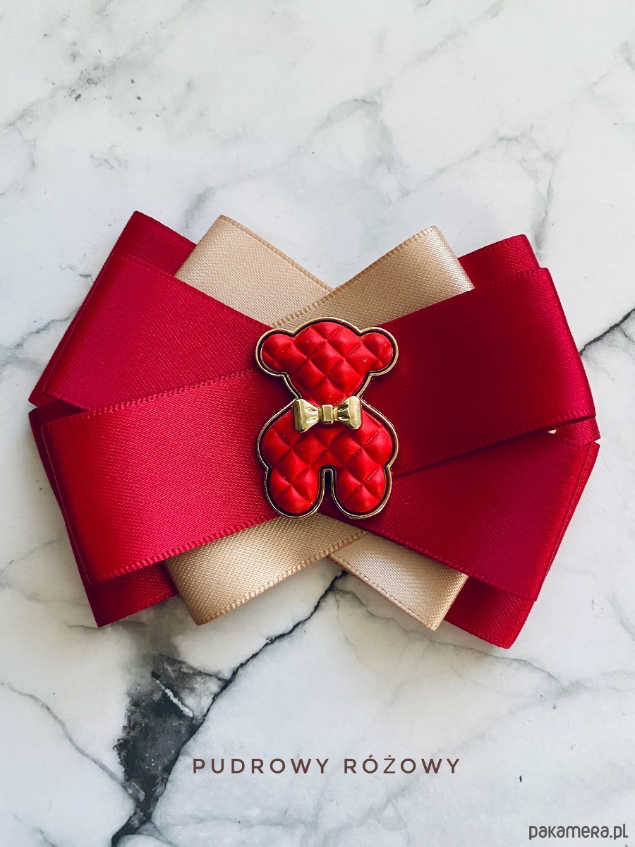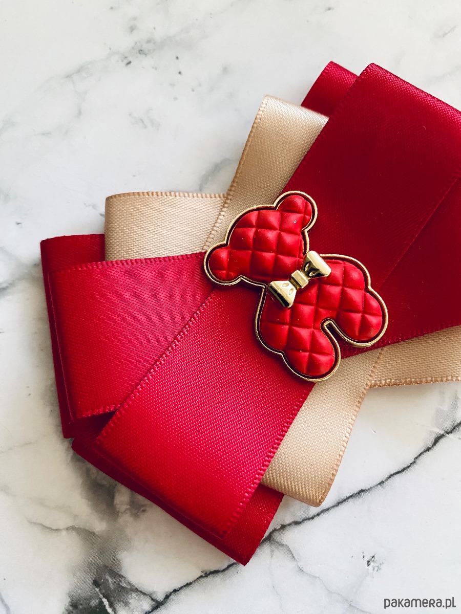 Cudowny Miś wykonany z ciekawej kratkowanej masy w kolorze czerwonym z urocza złota kokardka.