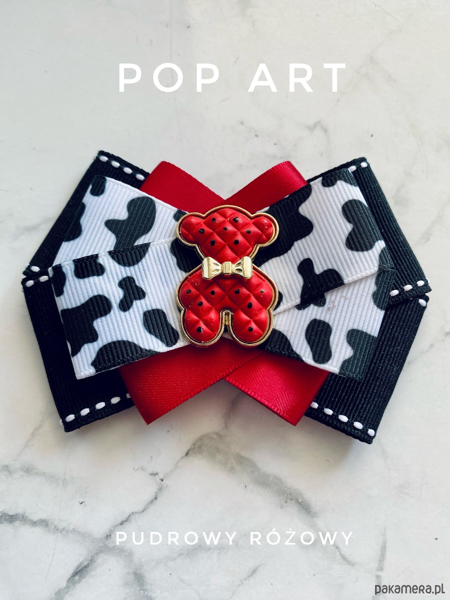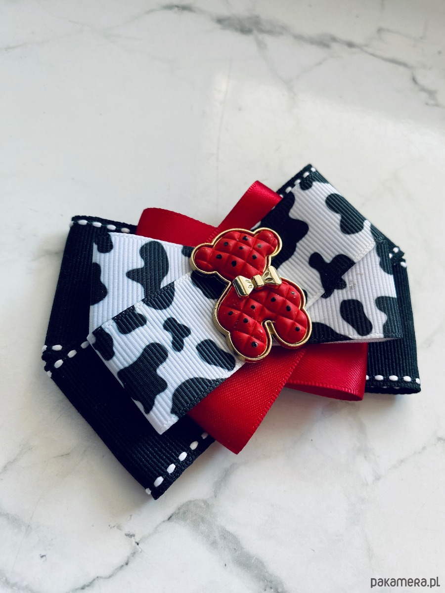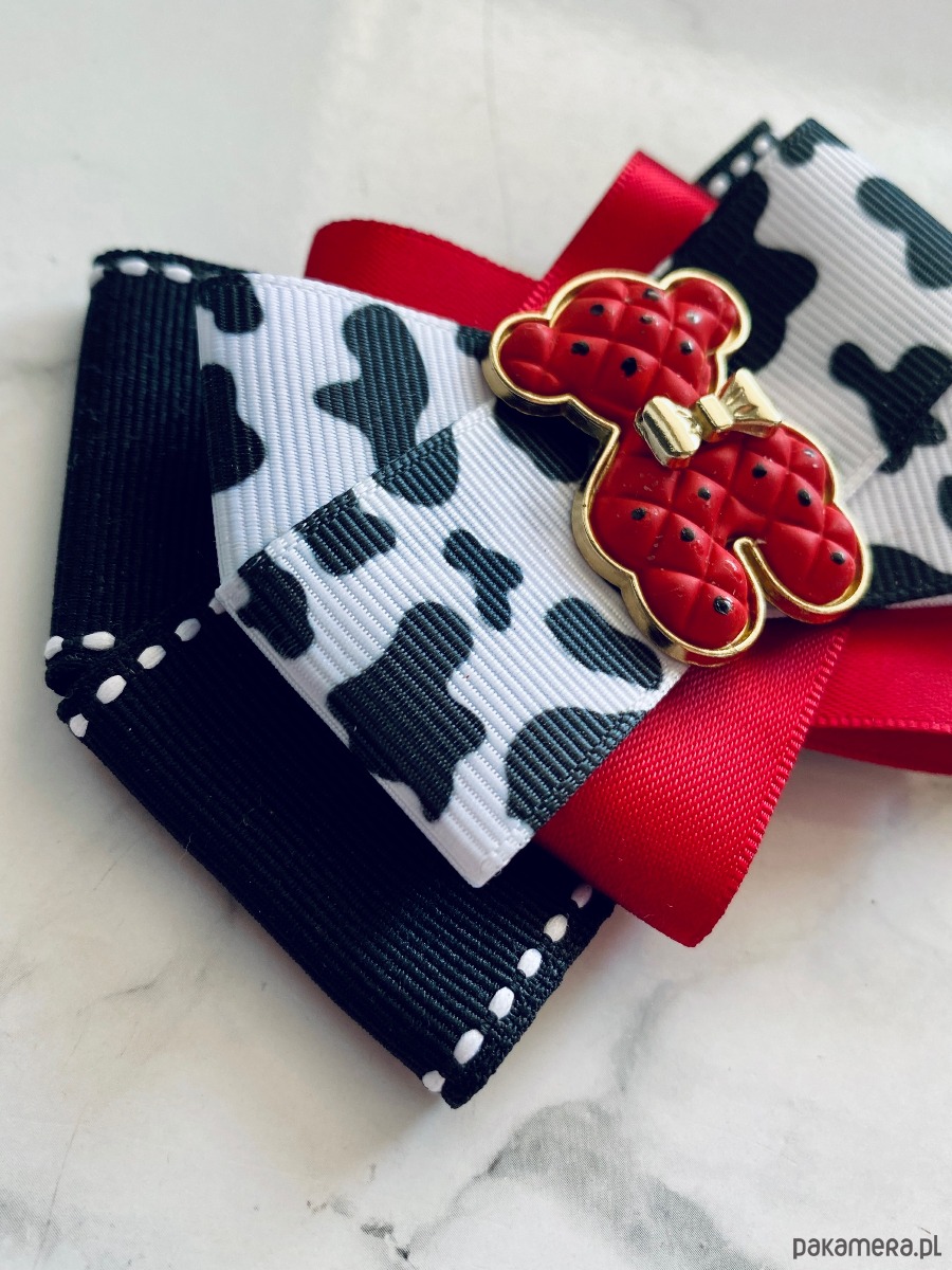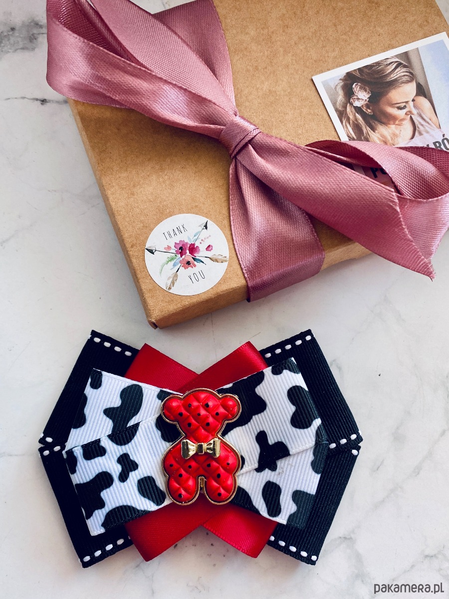 Cudowny Miś wykonany z ciekawej kratkowanej masy w kolorze czerwonym z kropeczkami z urocza złota kokardka.