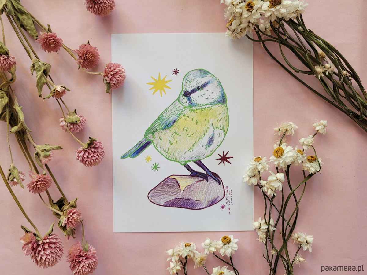 Oryginalna ilustracja powstała za pomocą kredek, w serii razem z kaczuszką, jemiołuszką i gołębiem. Inne ptaki z tej serii są również dostępne w formie pocztówek i naklejek!