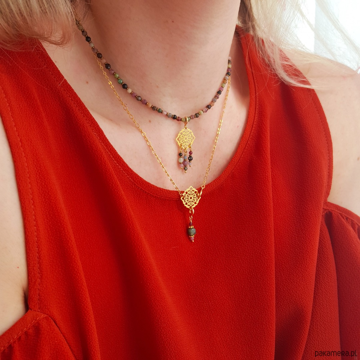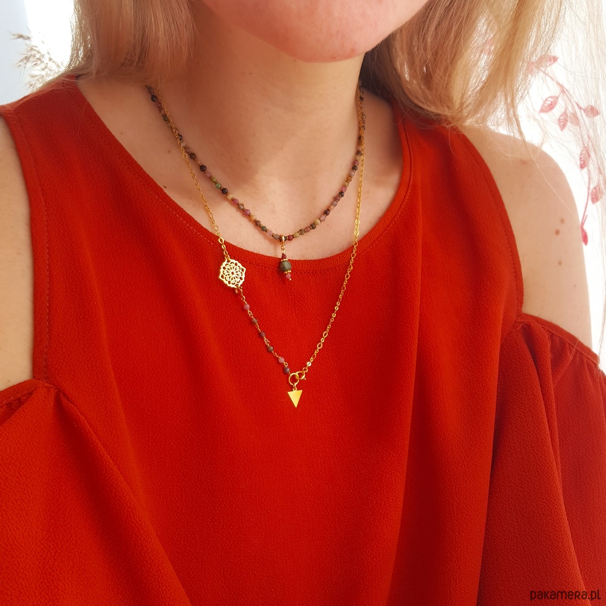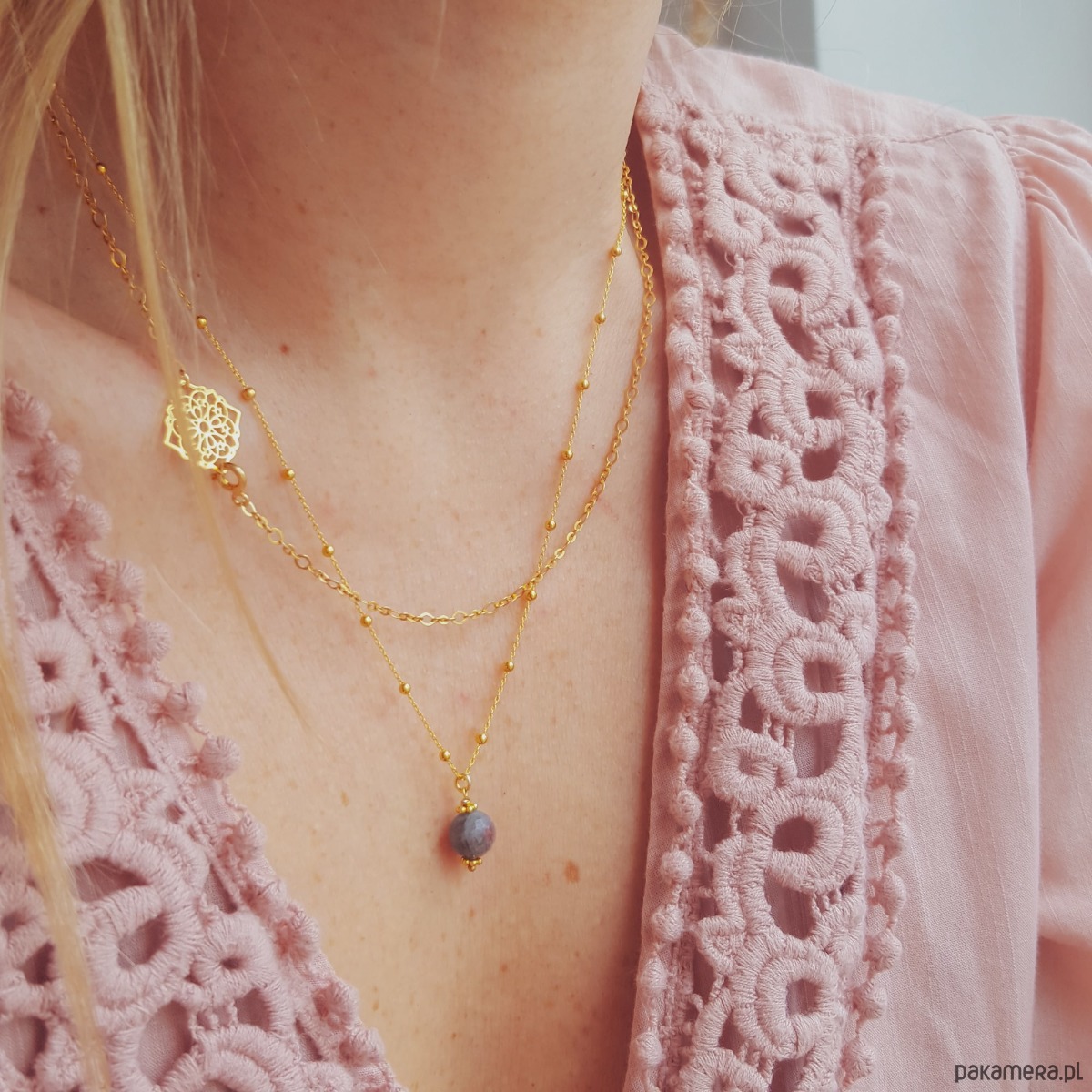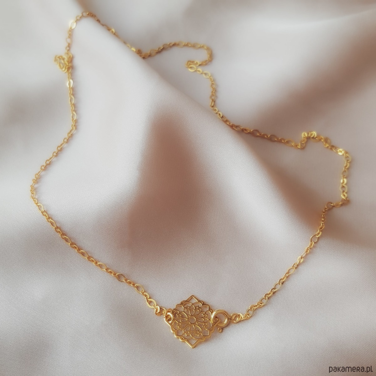 Złoty naszyjnik z ażurową rozetą wykonany ze srebra 925 pozłacanego 24K złotem. Baza, która pięknie prezentuje się osobno, ale można łączyć ją także z dedykowanymi zawieszkami– całkowicie odmieniając jej wygląd. Oferta dotyczy łańcuszka z rozetą zaprezentowanego na głównym zdjęciu. Dodatkowe zawieszki wystawione są do zakupu w innych naszych ofertach. Zdjęcia w galerii przedstawiają kilka sposobów łączenia bazy z zawieszkami. Naszyjnik jest zapinany z przodu na subtelny karabińczyk, który wpina się w ażurową rozetę… albo dowolne ogniwo łańcuszka powyżej rozety, dzięki czemu samą bazę można nosić na dwa różne sposoby ?