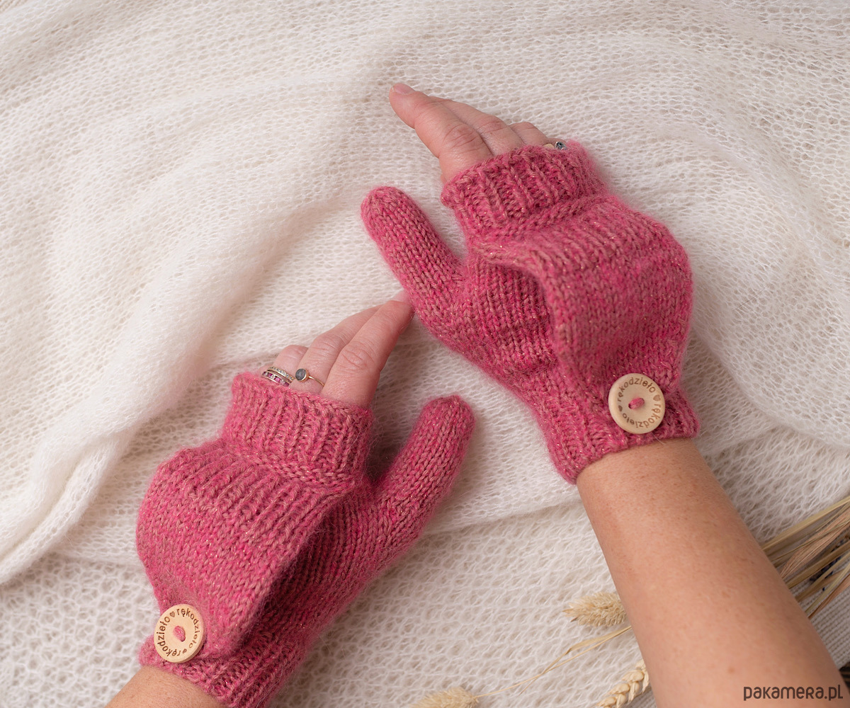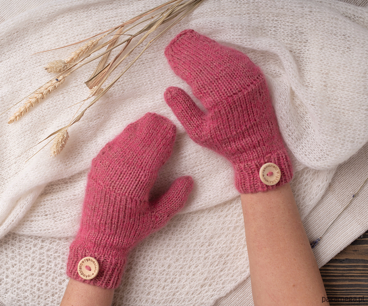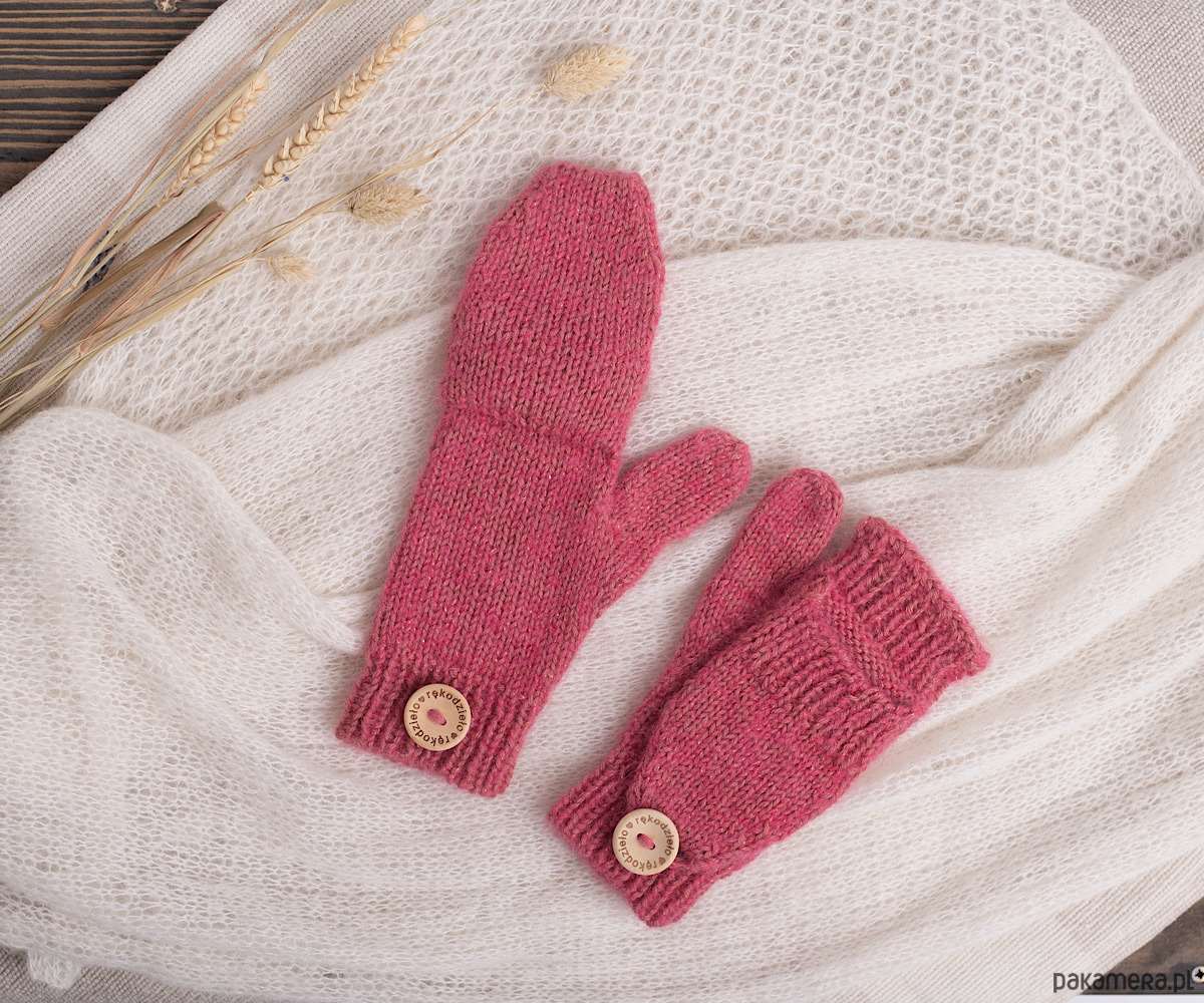 Ręcznie robione rękawiczki/mitenki z klapką w pięknym różowym kolorze. Wykonane z połączenia dwóch rodzajów wełny: pierwsza to 100% merynos, druga to mieszanka baby alpaki 68% , wełna merynosa 12%, poliamid (dla wzmocnienia )16% oraz cienka nitka lurex, która nadaje połysku 4% .