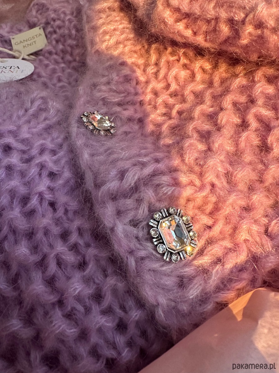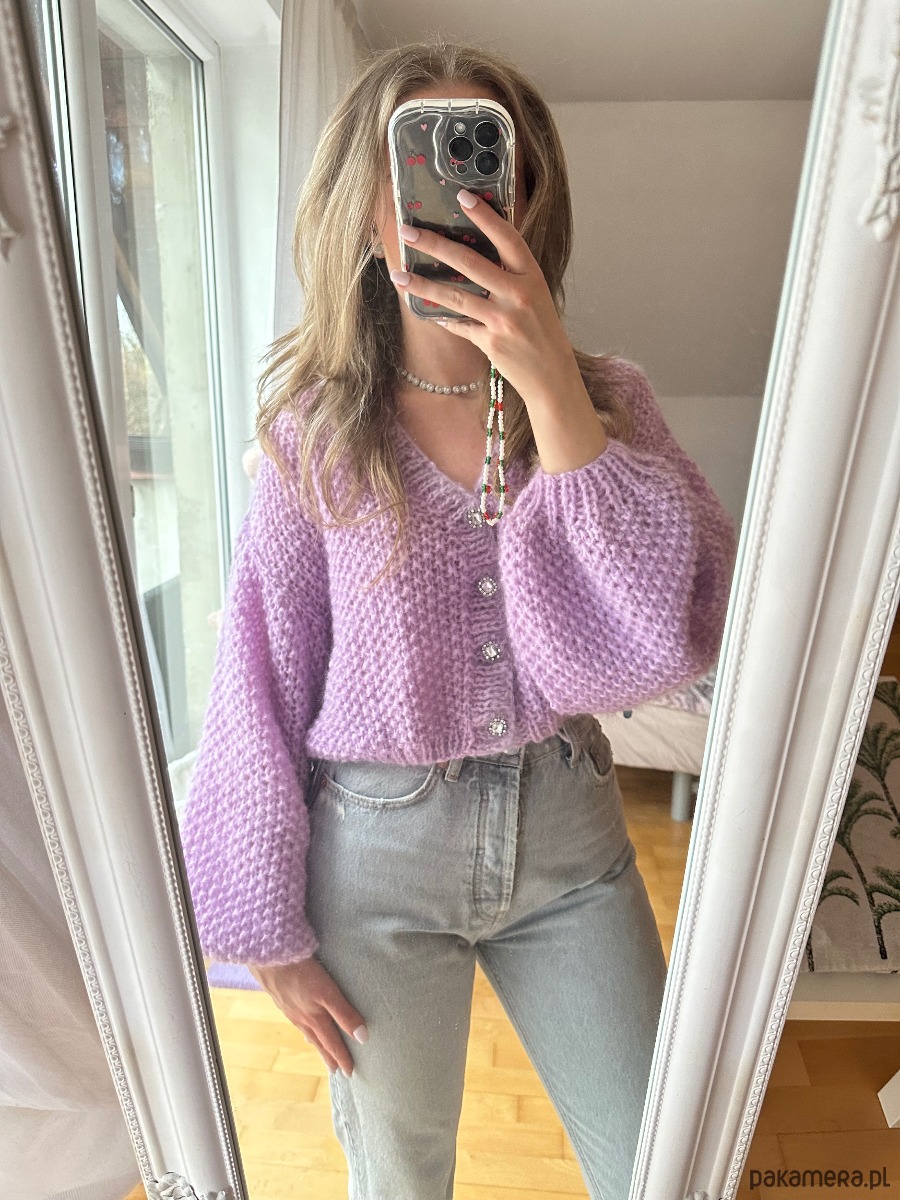 Moherowy kardigan mgiełka z ozdobnymi biżuteryjnymi guzikami handmade
