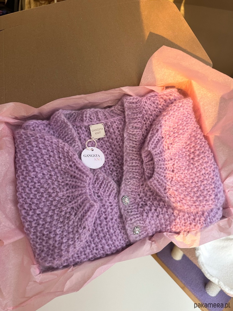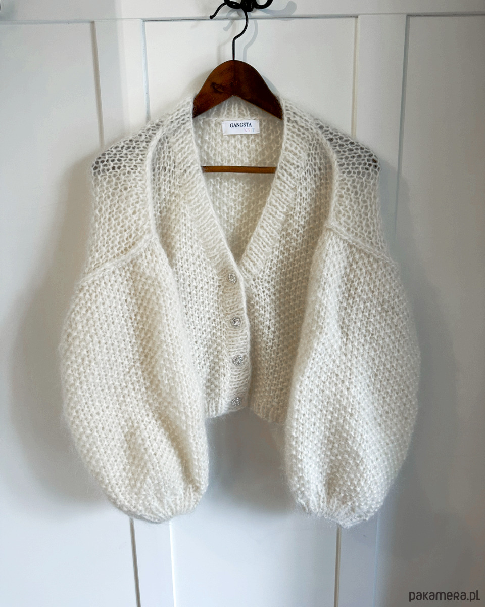 Moherowy kardigan mgiełka z ozdobnymi biżuteryjnymi guzikami handmade